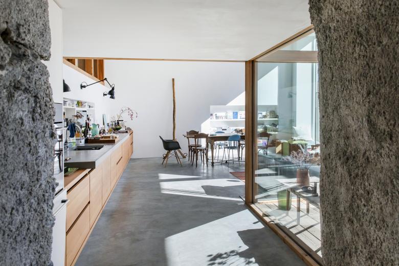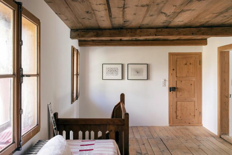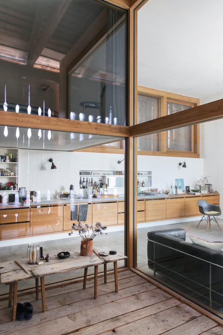 Der in der Turmachse entstandene Innenhof im alten Heustall bildet ein zentrales Element in der Choreografie und in der Statik im schmalen und langen Gebäude.