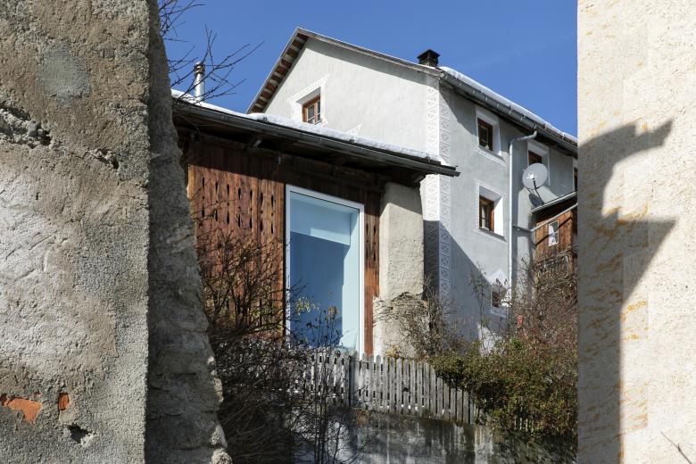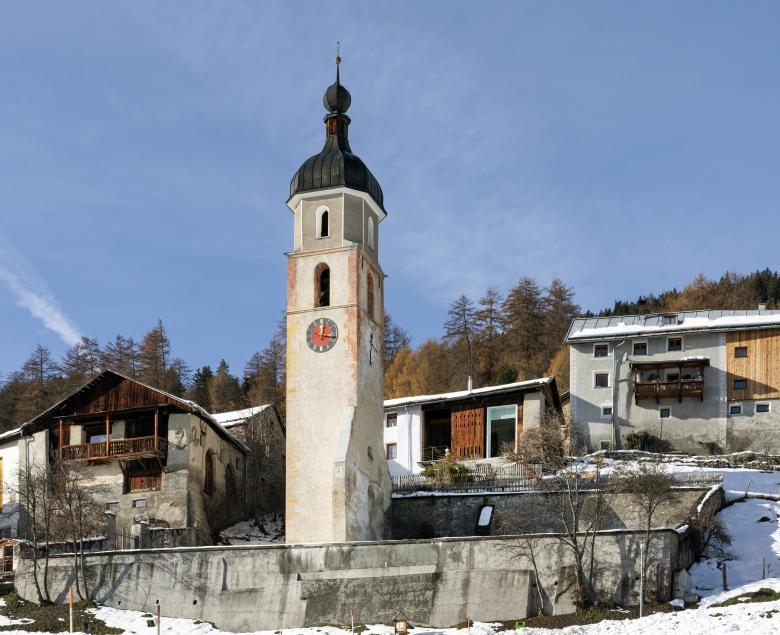 Der gegenüberliegende freistehende Kirchturm San Jon da Tschlin prägt mit seiner Präsenz vor dem Gebäude den Ort und den Aussenraum.