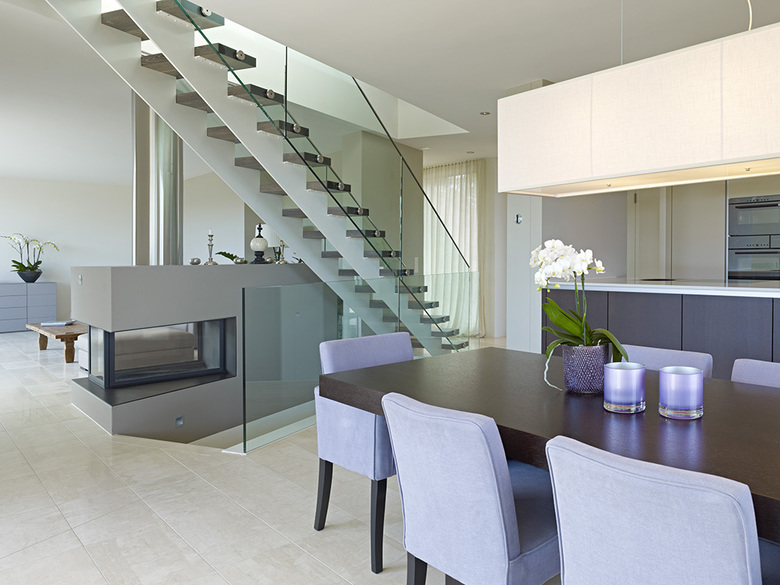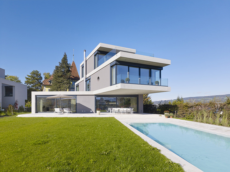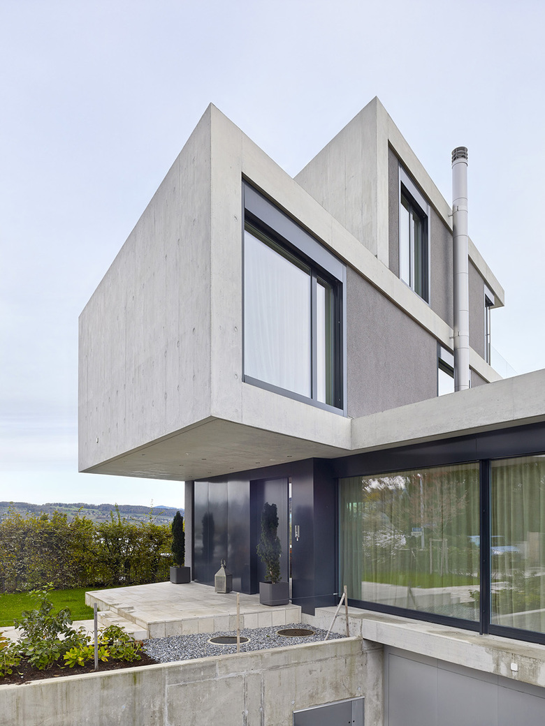 Das grosszügige Einfamilienhaus steht nahe einer Hangkante erhöht am Rande der Gemeinde Wädenswil. Die sich überlagernden Baukörper des Gebäudes, die Positionierung der Aussenterrasse im EG sowie der transparente gestaltete Wohn- und Essraum ermöglichen eine optimale Kombination von Seesicht auf der einen Seite der Wohnräume und Sonnenuntergang auf der anderen Seite.