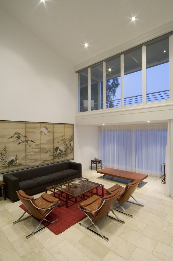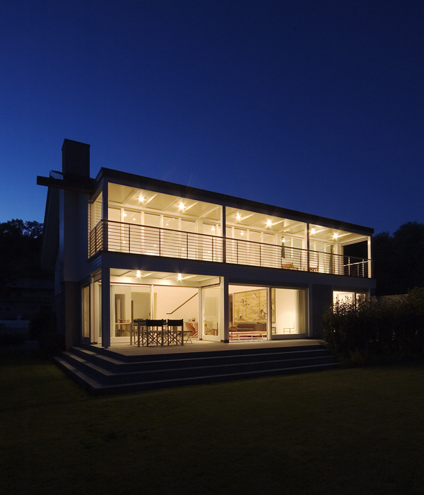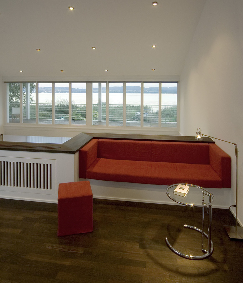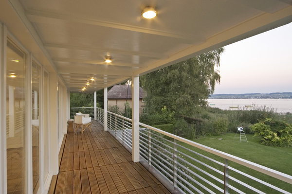 Damit die verlangten Raumprogrammteile nicht in Form eines additiven Aufbaus in Erscheinung treten, wird die gesamte Dachfläche des Hauses um 1,70 Meter angehoben. Diese Massnahme erweitert einerseits den Wohnbereich um eine grosszügige Galerie, andererseits kann dem neuen Schlafzimmer ein lang gestreckter Balkon vorgelagert werden, welcher, einem Schiffsdeck ähnlich, die gesamte Hausbreite einnimmt. Mit der Galerie, dem Schlafzimmer und der gedeckten Terrasse entstehen somit drei vollkommen unterschiedliche Räume, die allesamt vom herrlichen Ausblick auf den Murtensee profitieren. Die Strategie des Weiterbauens findet auch im Innern ihre logische Fortsetzung. So werden zum Beispiel der Natursteinbelag aus Jurakalk, die Küche und die Badezimmer im Erdgeschosses genauso belassen und in den neuen Zusammenhang integriert wie zahlreiche Möbel und Einrichtungsgegenstände. Wenige ausgewählte Materialien wie Räuchereiche, hellgrünes Glasmosaik und dunkler Basalt erweitern die Farb- und Materialpalette aus dem Bestand heraus und schaffen eine neue Gesamtheit von hoher atmosphärischer Dichte.
