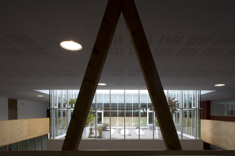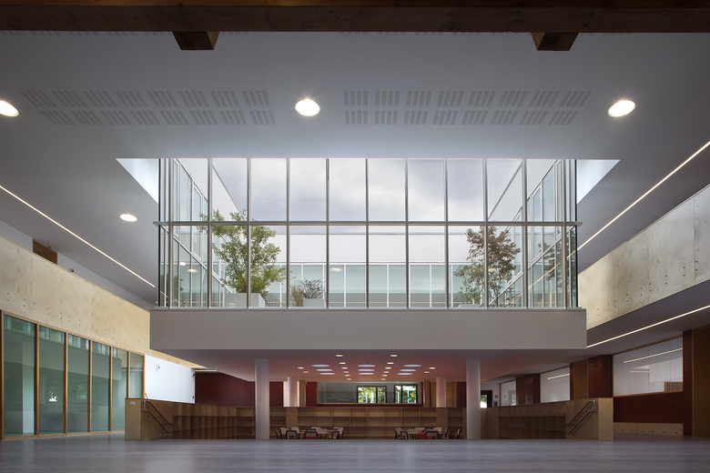 The intervisibility is also emphasized by the visual connections between the different levels, thanks to the double hight designed for the main entrance and to the design of a glazed ‘lantern of light’ that is suspended over the library, which gives character to the school entrance hall. The suspended lantern houses a ‘botanic garden’ for outdoor experimentations.