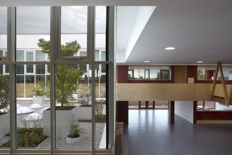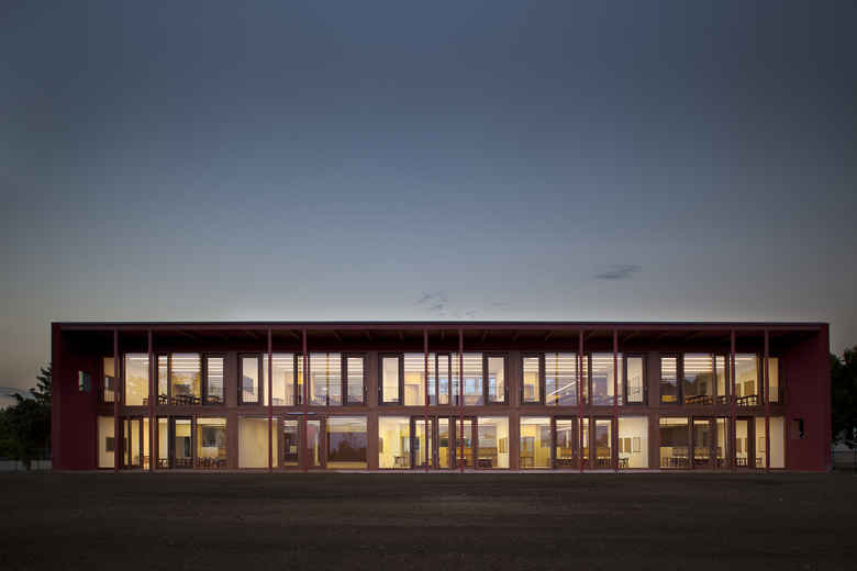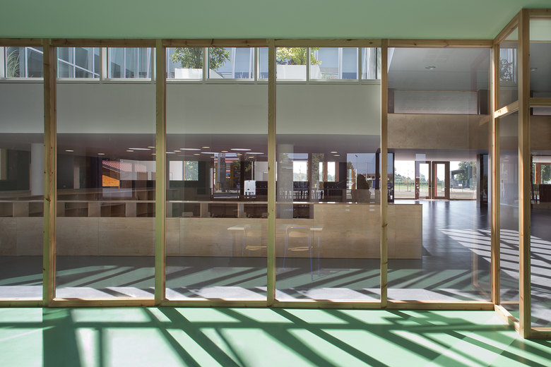 A glazed facade, facing the South-West side, opens the view on the sorrounding countryside. The walls which separate the classrooms from the corridors are opaque only for the first 120cm and glazed on the upper parts. This condition enhances the intervisibility from the outside space and among the inner spaces.
