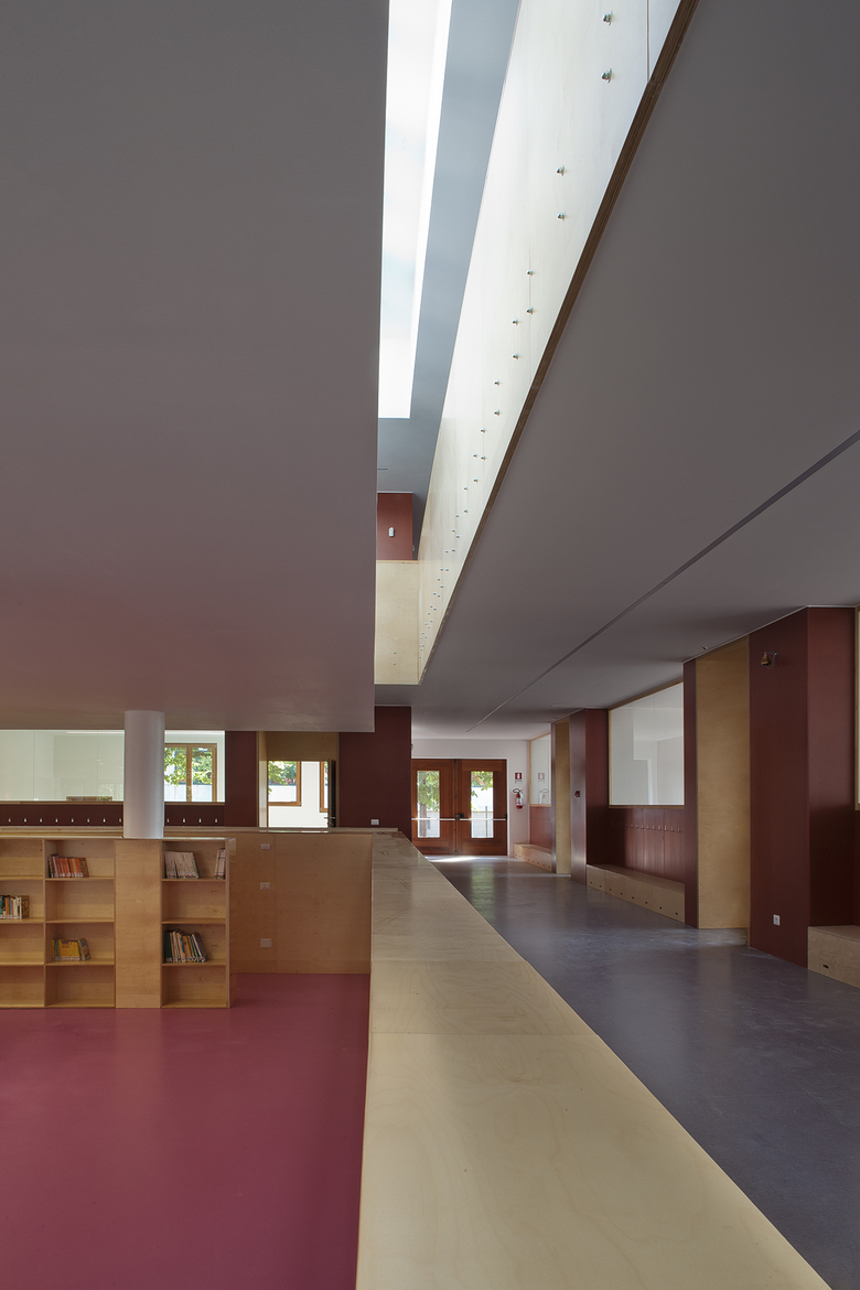 No corridors are used for the school layout as all the classrooms’ access happens on the main entrance hall on the ground level and thanks to a suspended balcony on the first floor. This solution maximizes the visibility among the spaces.