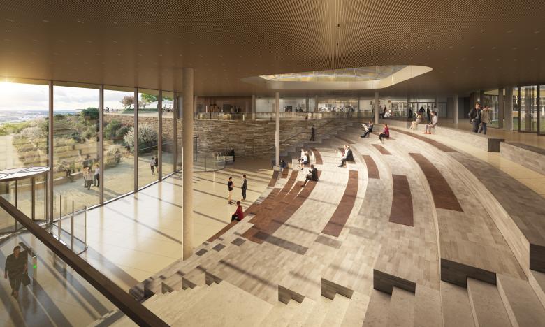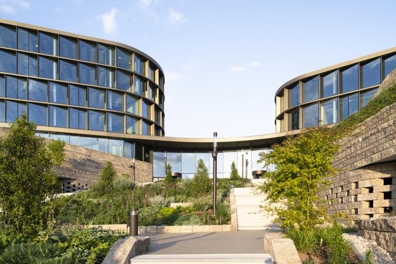 Für die Schwarz Gruppe plant JSWD einen Projekt-Campus mit 5.000 Arbeitsplätzen. Wie große Blütenblätter liegen die Gebäude des Projekt-Campus Bad Friedrichshall in der topografisch geprägten Landschaft. Trotz ihrer solitären Anmutung sind die Baukörper so gesetzt, dass sie eine gemeinsame, grüne Mitte umschließen. Wie Terrasse gestaffelt bilden die zum Tal offenen Parkhausebenen ein Plateau für die Hochbauten.