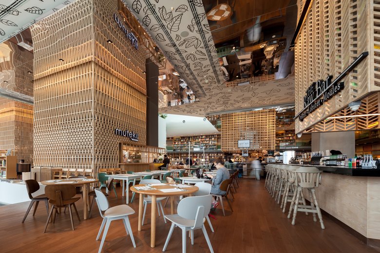 The brief revolved around fourteen restaurants and bars, a bookstore, a co-working space, a kid’s space and various communal areas. With so many components and functions it became clear right from the outset that navigation was the key to the project. How could we break down this aircraft-hanger-like space into an understandable and seamlessly connected village? By developing a series of towers for each of the restaurants we could: