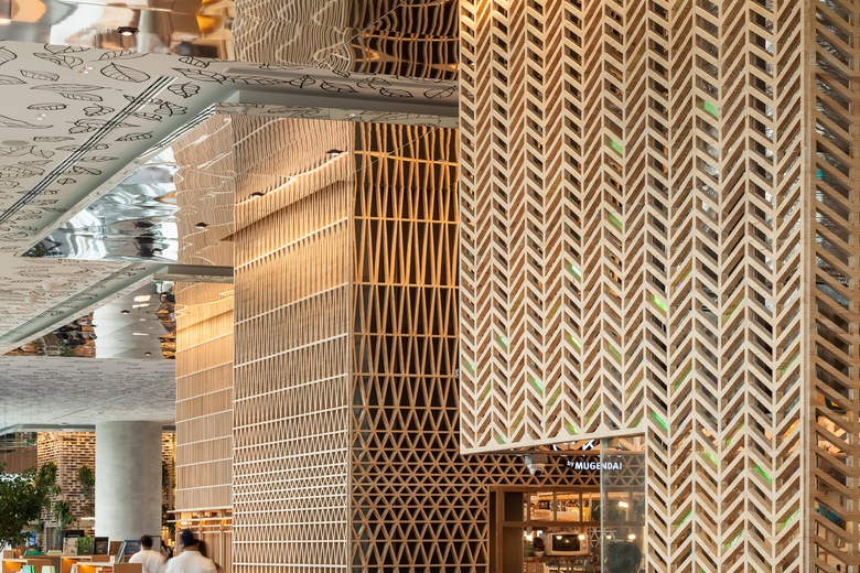 The towers are clad in a family of different timber fretwork patterns; the variety in these patterns serves to change the way light passes through the towers as you move through the space. During the day the towers seem more solid while at night they dissolve, creating interesting layering effects and moiré patterns. Mirrored panels on the ceiling around the towers make them appear to extend beyond the space and also break down the immensity of the ceiling.