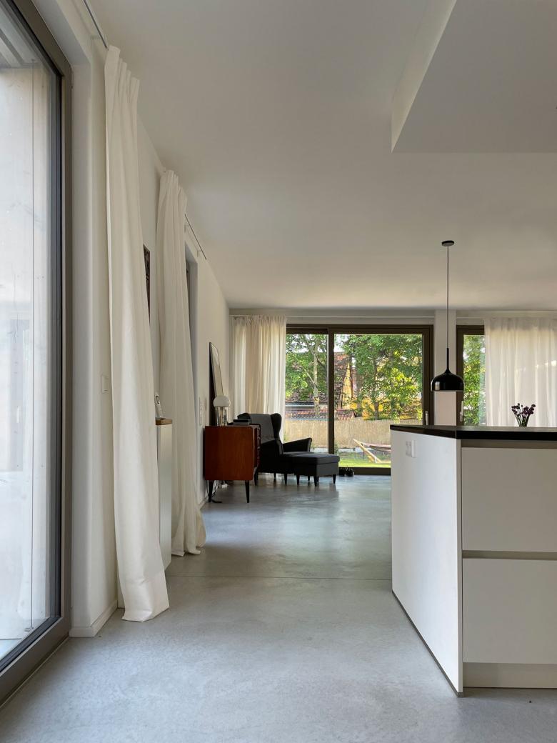 Das Wohnhaus in Holzmassivbauweise passt sich einem langgestreckten Grundstück an, die Rundung im Norden ist dabei das Ergebnis des nach Norden enger werdenden Baufeldes. Die Fassade ist mit Kanthölzern strukturiert, in die sich die Fenster und Öffnungen einpassen.