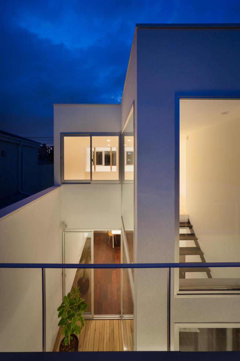 それを解決すべく、3層のプランがそれぞれのフロアで完結するのではなく、階を縦断して繋がるように計画しました。階段室や吹抜けなどの縦の空間を有効に利用し上下のつながりを造ったり、小さいながらも外部デッキテラスを設けることで、横への広がりもある空間を提案しました。