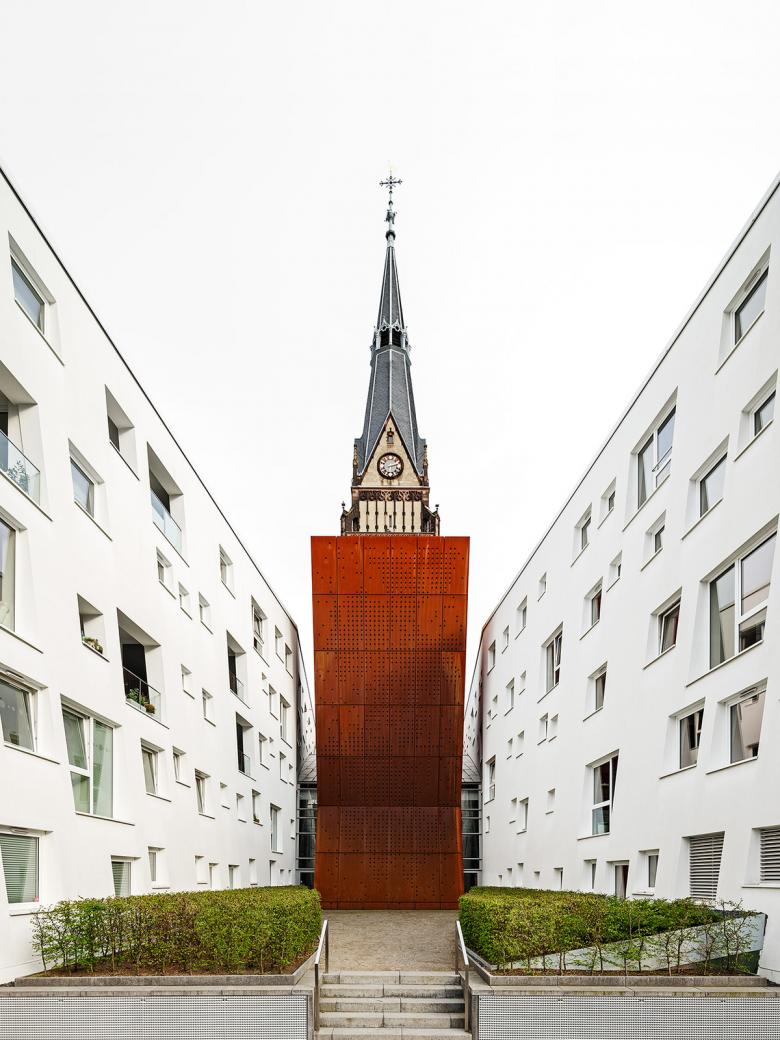 The nave of the neo-Gothic Christuskirche Köln (1894) was demolished in 2014 to make way for a new worship hall flanked by five-story wings containing apartments and commercial space designed by Hollenbeck Architektur and Maier Architekten.