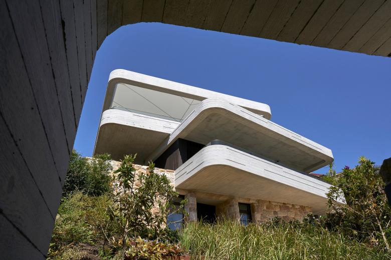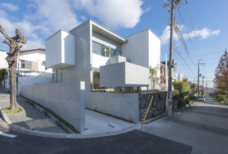 Akira Sakamoto Architect & Associates' House in Gein, Osaka, is a composition of concrete surfaces and protruding boxes, anchored by a raised patio reached from an elevated yard.
