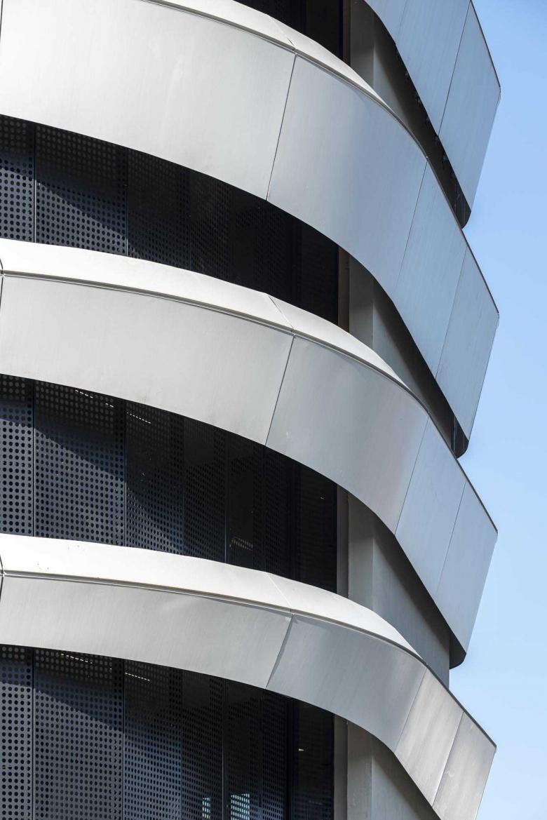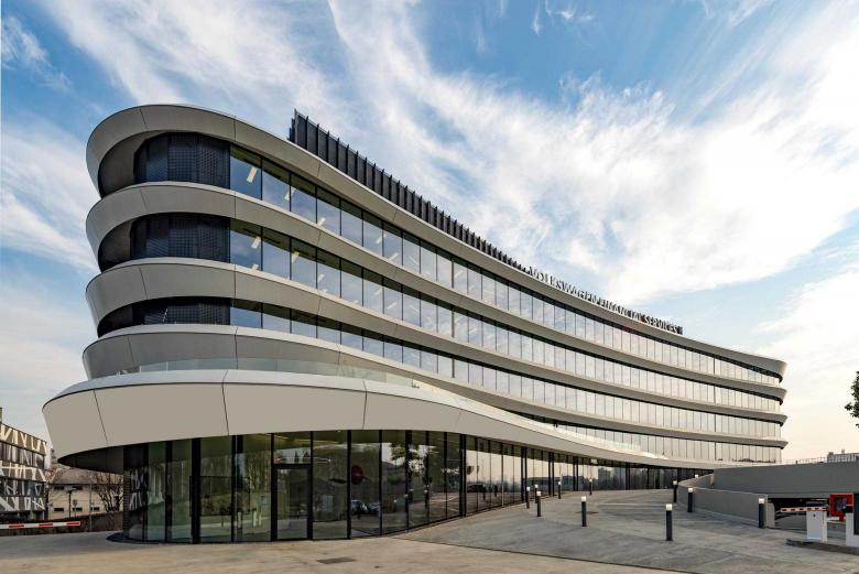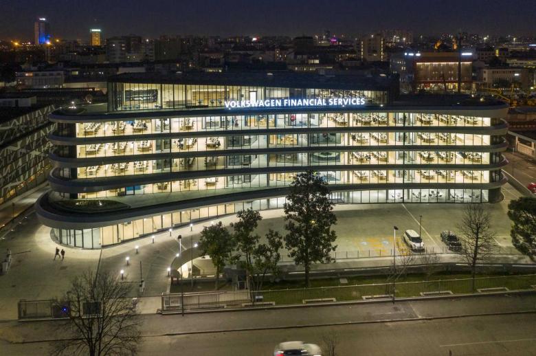 Sede del nuovo headquarter di Volkswagen Leasing GmbH e Volkswagen Bank GmbH, l'edificio, completamente rinnovato grazie al progetto sartoriale dello studio dell’architetto Giuseppe Tortato, che vanta un’esperienza ventennale nel settore della rigenerazione urbana, si presenta con un'architettura sinuosa e dalla forte personalità, caratterizzata da un contrasto raffinato tra il bianco dei fascioni curvilinei a sezione variabile che abbracciano l'edificio sul fronte strada ed il grigio antracite che caratterizza i volumi spigolosi e tesi del resto dell'edificio. Un involucro di design che racchiude spazi flessibili portando benessere a chi ci lavora e dove sono stati “inseriti” elementi naturali quali l'aria, la luce ed il verde, utilizzandoli quasi fossero materiale da costruzione.