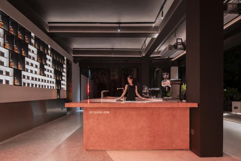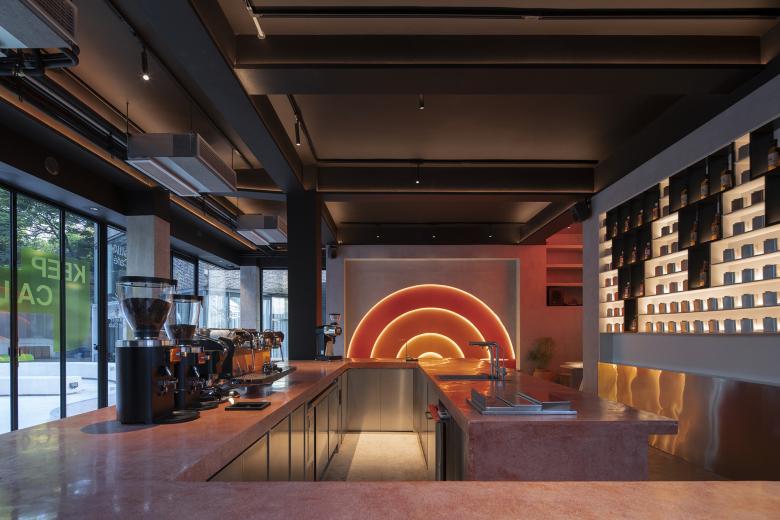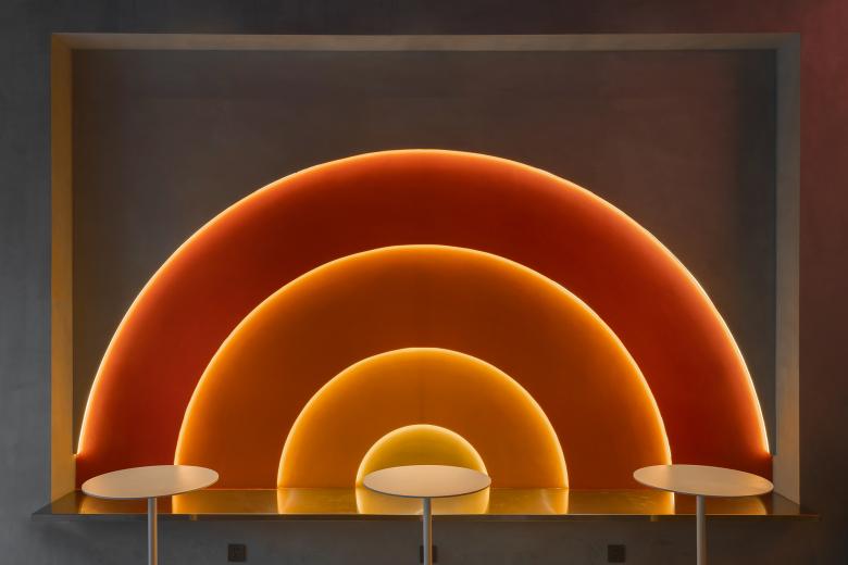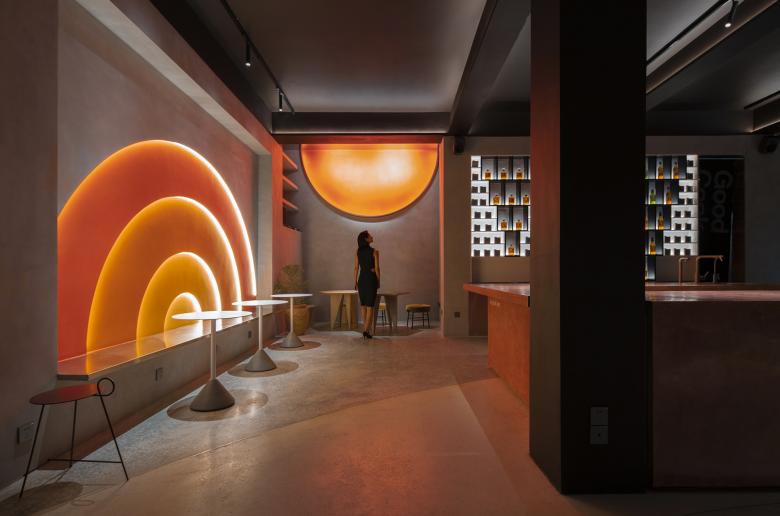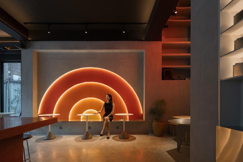 Wilson had asked if there would be too many orange circles in the interior, and my answer was: just right. Like the light of the setting sun, different orange colors are embedded in the walls, and the orange circles / semi-circles in Popped Orange space are reflected and illuminated to achieve the relaxation, pleasure and tenderness at sunset, which happens to coincide with Uhub HOUSE's "Sunset Club". Sunset represents a shift between day and night, and as night falls, the lights turn on, and the coffee bar transforms into "Young Girl on the Threshold of the Garden at Bellevue". The gentle light in the night mode, bouncing back from the wall and through the wine on the cabinet, lit up the mood at night.