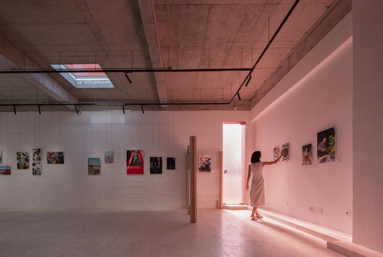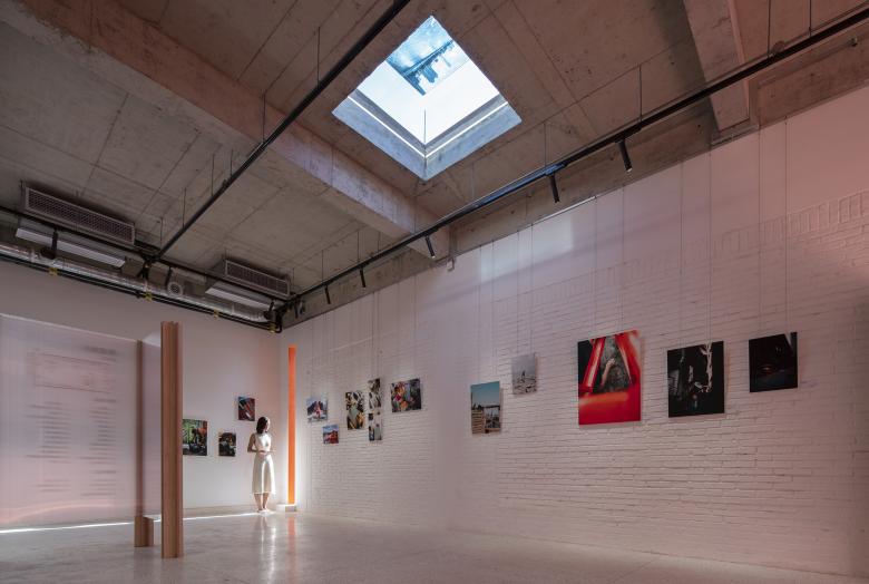 The second floor is flexible and changeable according to the operation demand, no fixed partition is set up. The partitions perform as white exhibition walls below its 3 meter height, then retains the original concrete above. Through the long strip windows, square skylights and glass doors, natural light is blended into the atmosphere. The first event during the trial operation is the shot on iPhone street topography - photography exhibition organized by Apple. More exciting events will happen here in the future, and you can always enjoy the unpredictable surprise whenever you reach the entrance on the second floor.