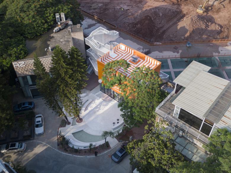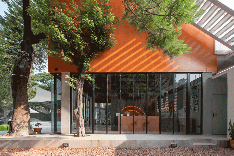 Because of the COVID, we were unable to go to the site. The construction process was also very constrained, which gave me the opportunity to deliberately adjust and refine it. When I noticed that the orange façade ended at the short wall pressure line, with both of them in white, I thought it would be a great moment to recall the demolished Anaya Visitor Center. Starting from the roof skylight booth, the entrance and the outdoor bar, the pattern composed to form orange geometries as a fifth façade on the roof. It finally expresses the complete visual theme of Popped Orange.