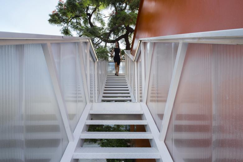 Wilson insisted that the outdoor steel ladder should be artistic. Wutopia Lab used steel, sun panels and white color to create a the tower of light, as a response to the main body of the orange Uhub HOUSE. I hope that the light tower with a structure height of 11.27m can be light enough to read as detached from the main body. Hu, who lived up to his trust (a structural engineer I mentioned several times), only set up a 300mm×300mm independent steel column for the light tower to make the stairs stand upright.