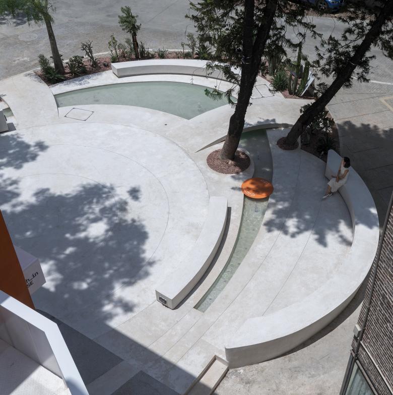 The middle floor is an orange cube floating above the white garden, which is the main form of the building, symbolizing ifanr's slogan "A good product is a candy," and the Uhub HOUSE is an orange fruit candy in T.I.T Creative Park.