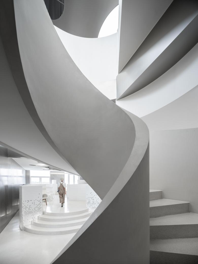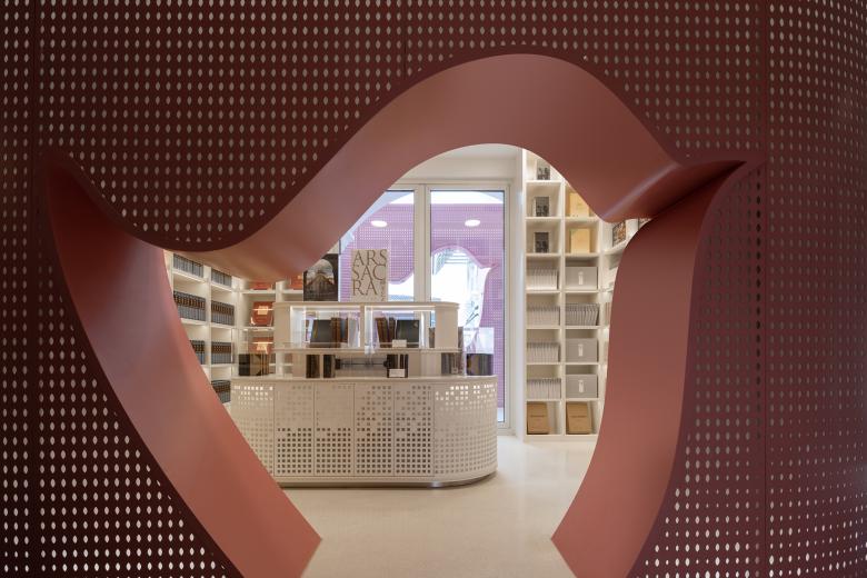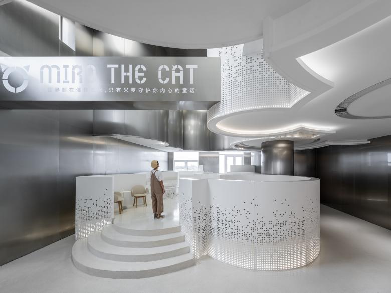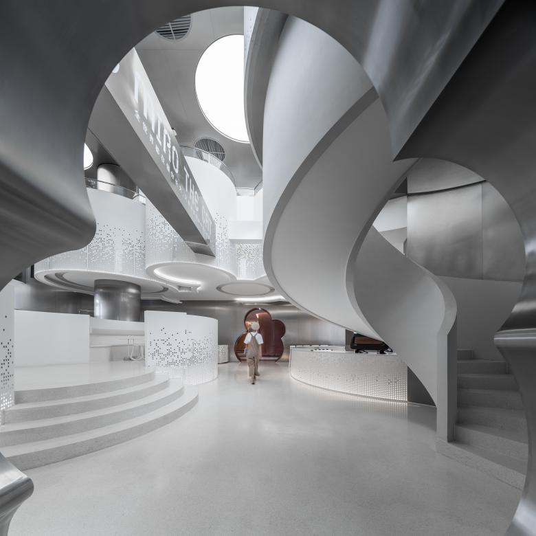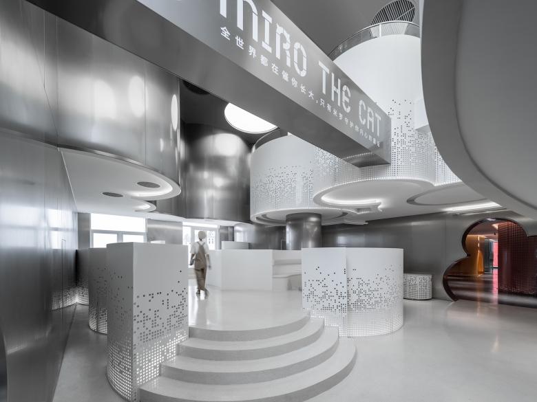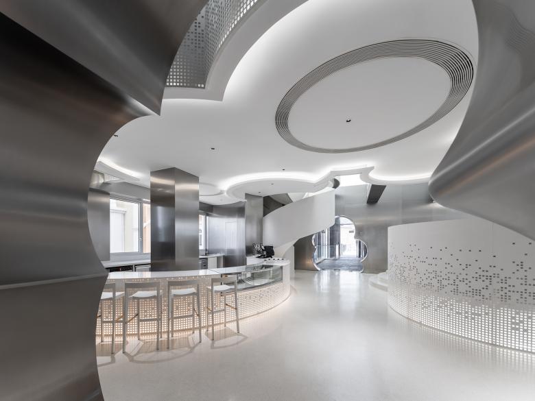 Behind the Cloud Gate is the cloud-themed family-friendly area, the Cloud Terrace Cafe. We wrapped a layered, interlocking floating platform with a transition from white gradient perforated aluminum panels to brushed stainless steel on the entire surface. The reader feels as if they are walking through the clouds and resting among them. Here I insisted on using silver and white to create a quiet and private atmosphere. This is because I want to give the reader a moment of peace. So that when they pass through another cloud door, they can be warmly and astonishingly enveloped by the climax of the Miro store of Duoyun Bookstore, a magnificent and dramatic drawing library, a colorful ocean filled with everything.