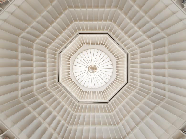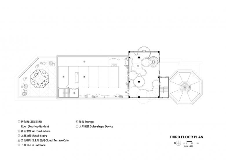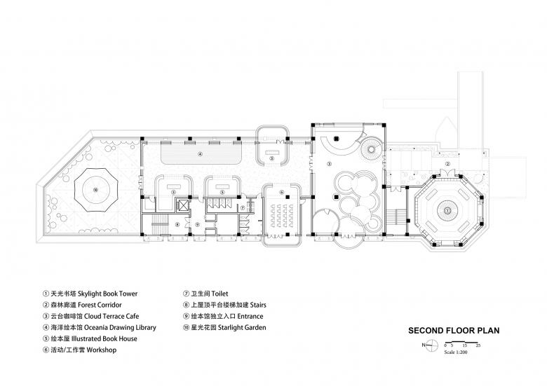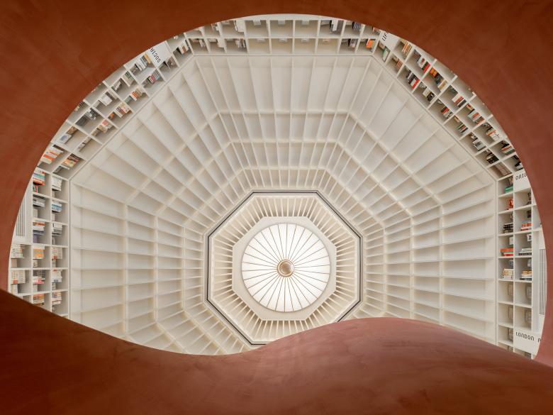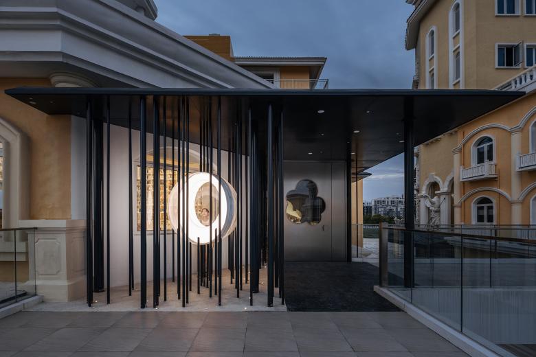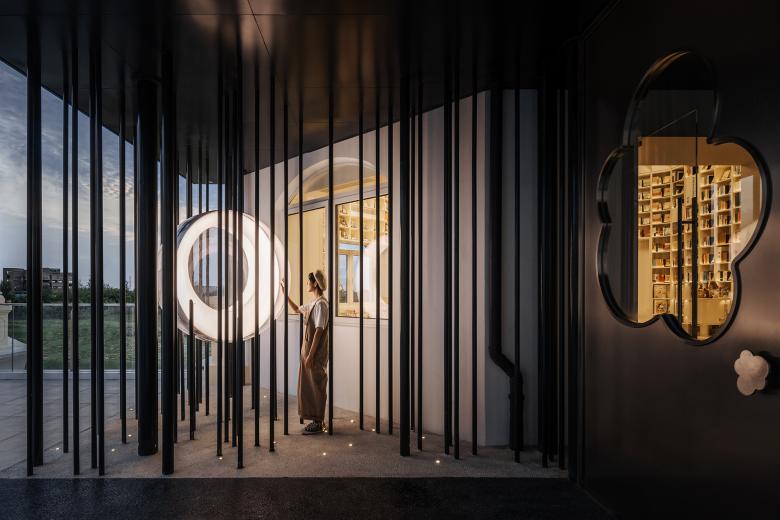 Stepping out of the white Skylight Book Tower is an abstract black forest. A sparse arrangement of black metal rods supports the partially hollowed-out dark metal roof. When the sun shines directly, the light weaves through the green gaps and the black ground emerges in shimmering patches of light, as if in a forest. This is the semi-outdoor forest corridor that leads to the main space of Duoyun Bookstore. At the end of the corridor is a cloud gate, a symbol identified at the Huangshan store of Duoyun Bookstore. Looking in through the Cloud Gate, a new world is beckoning. Meanwhile, visitors will also catch the vision of the moon in the cloud gate, and looking back down the path, a curved moon in the forest is smiling. It corresponds to the very sun at the top of the Skylight Book Tower.