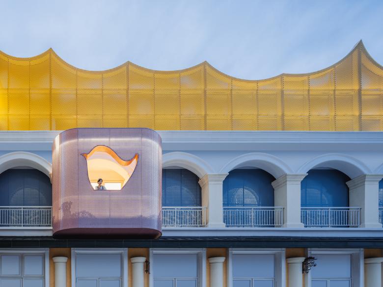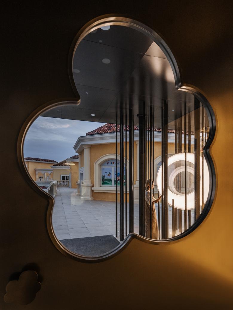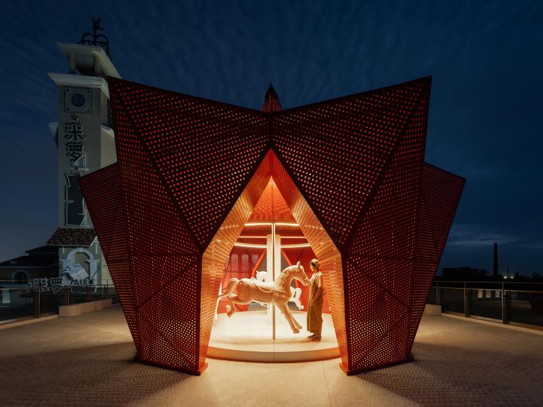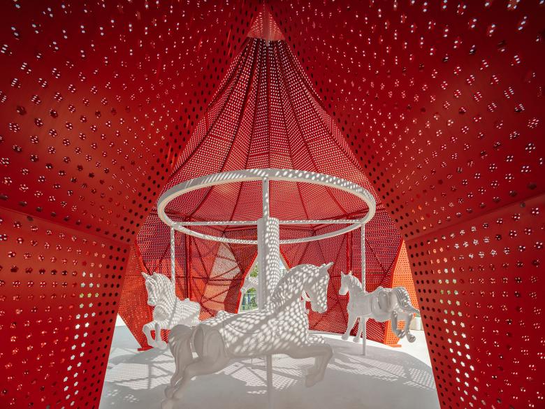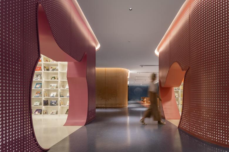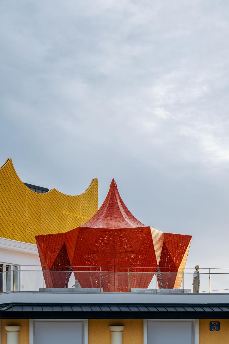 There is a striking red perforated aluminum panel tent on the terrace outside the drawing library. Visitors can notice the flaming tent as they enter from the town square. The tent comes from two sources, The Circus of the Miro's IP and the red flying house on the roof of the Anaya children's restaurant designed by Wutopia lab five years ago. The carousel in the tent is the recurring symbol of Wutopia lab's designs about children and dreams, representing a kind of adult childlike spirit that Wutopia lab insists on preserving. The red tent stands quietly on the fluorite floor. When night comes, the fluorite, which absorbs daylight, shines like a starry sky. We call this the Star Garden. The tent on the stars is a child's declaration, "I want always to be a little boy and to have fun."