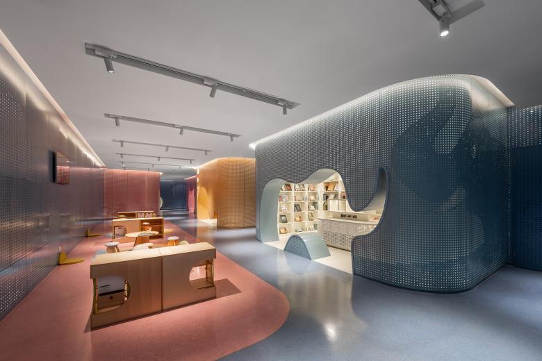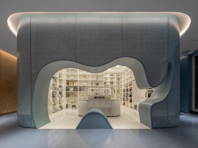 The main part of the Miro store of Duoyun Bookstore is the drawing library on the first floor. Since I am particularly fascinated by the idea of separating contiguous rooms within each other to form a type of house within a house under a complete large space, I divided the picture books into four groups according to theme into different individual huts. Inspired by the Miro's IP The Creation, I used different levels of blue to turn the whole drawing library into an ocean. Four of the animals from The Creation, sea creatures, amphibians, birds, and mammals, were selected and abstracted to form the animal-shaped entrances of the huts. The different holes combined with the different coloured perforated aluminum panels form the different facades of the huts, while the inside of the huts is uniformly white. After all, no matter how noisy it is, reading needs to remain quiet. The whole drawing library is a tribute and a spatial interpretation of The Creation.
