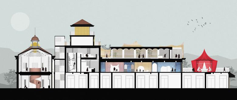 I created rolling 'mountains' with gold perforated aluminum panels on the roof of the drawing library, and a glass house with a wave-tossed ceiling hidden inside the gold mountain. This multi-purpose hall, named the Aozora Lecture Hall, can be used for exhibitions, roadshows, book signings, dinners, and parties. However, what I actually want is someone to contemplate unattached in a plain box inside the brilliant gold, and this moment is my Eden.