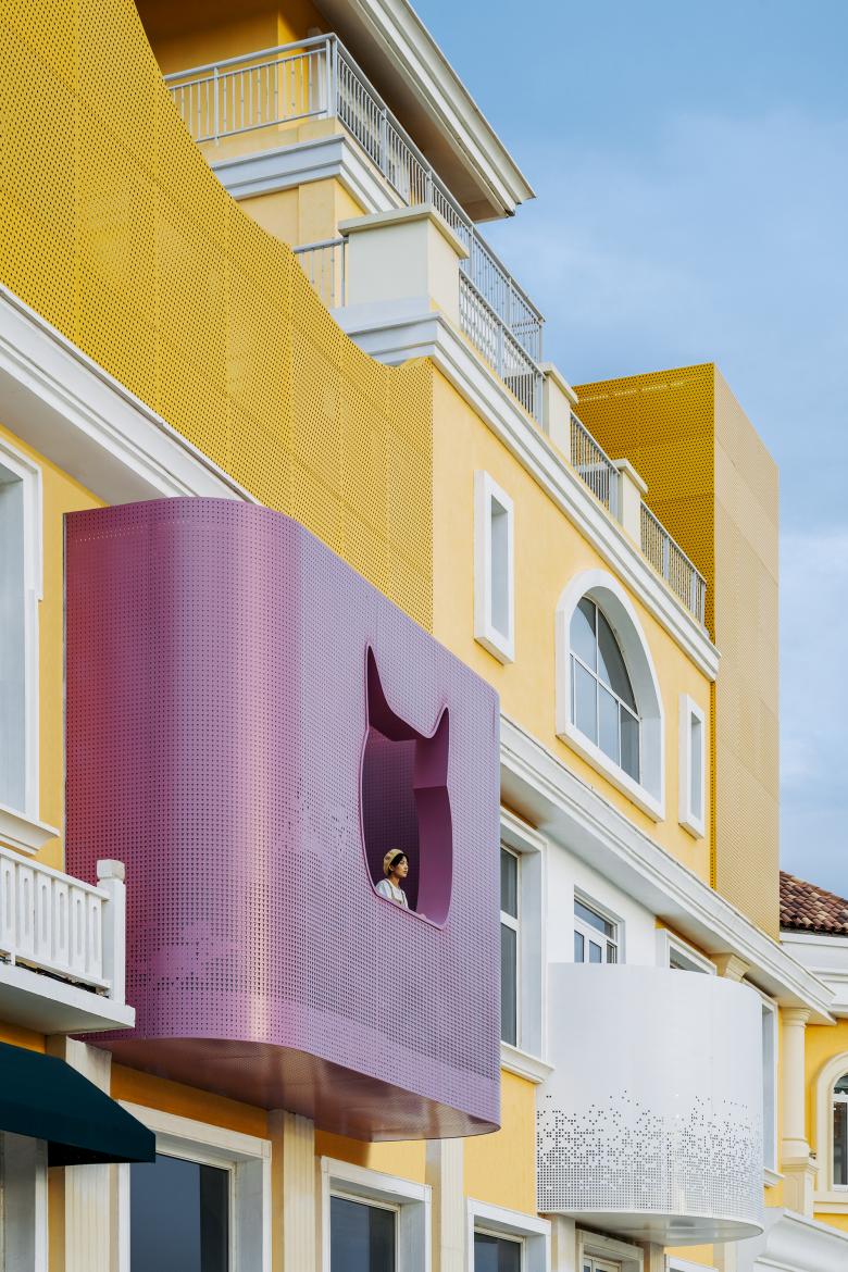 Main Materials: Perforated Aluminum Panels, Gold Terrazzo, Washed Stone, Micro-cement, Acrylic, Stainless Steel