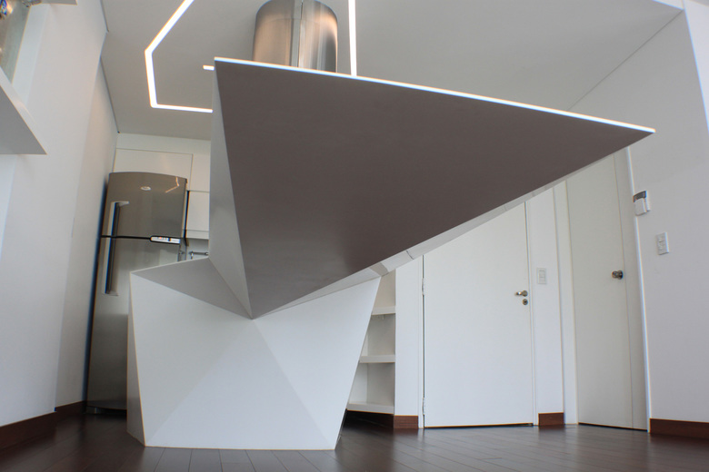 The decision was to make a single floating piece with a leading role organizing the lower plan. Special attention was paid to details and measures so when standing no matter from where you are looking at you can only see a 3mm thick table however when seating in the living area you can perceive the complexity in shapes and the strength of gravity playing an outstanding role.