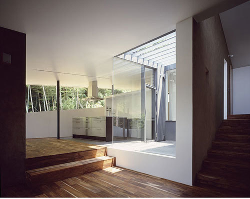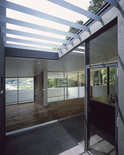 ほぼ正方形の平面形状の建物を斜面の中央に配置し、隣家が迫っている南および東側の外周部にL字型に壁をたて、眺めの良い北および西については腰壁で囲む。腰壁の高さは北西角に向かって低くなるようにすることにより、内部には南東角が最も閉鎖的で、北西角が最も開放的になるような空間がつくられた。つまり外周の壁の開き方により、内部空間に対角線の方向に開放性のグラデーションが生まれる。奥行きの深い平面形状であるため、中心に小さなコートをつくり、光を取り入れると同時に環状につながる空間の構造をつくる。そのコートのまわりに、斜面の地形をなぞるようにレベル差のある床を配置していった。最後に斜面と同じ方向の片流れの屋根をかけている。建築主からは壁で仕切られた個室をつくることは要望されなかったので、空間は床のレベル差によりゆるやかに分節されながらつながっている。最も開放的な北西のコーナーには奥行きの深いテラスがある。屋根と腰壁で囲まれた限りなく内部に近い外の部屋である。その東側の一段上がったレベルにはダイニング・キッチンがあり北側の竹林の切り取られた眺めを楽しむことができる。一方、南側には西に向かって開いたリビングがあり、丹沢の山並みを眺めることができる。最も奥まった高い位置に寝室がある。この寝室の上部の屋根だけを西に向かって跳ね上げることにより、眺望を確保し屋根のレベルに物干しとして利用できるテラスをつくった。このように、それぞれの場所は外部に対して異なる開き方をしているため、多様な場所が展開している。