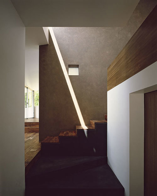 海老名市郊外の西に向かって下がるゆるやかな傾斜地に敷地はある。初めてこの敷地を訪れたとき、ゆるやかな斜面がとても美しいと感じた。予定では敷地はひな壇状に造成されると聞いていたので、すぐにこの斜面はそのままにしてほしいとお願いした。敷地の西側には丹沢山系の美しい山並みの眺めが広がり、北側には隣地の竹林に接している。一方、南側と東側はミニ開発によってつくられた住宅がひしめいている。つまり北および西側は美しい環境に接し、南および東側には隣家と接しているため、敷地に対して南東から北西に向かう空間の方向性を感じた。この斜面と敷地周辺の対角線上に落差のある環境の質の違いを計画に利用することを考えた。