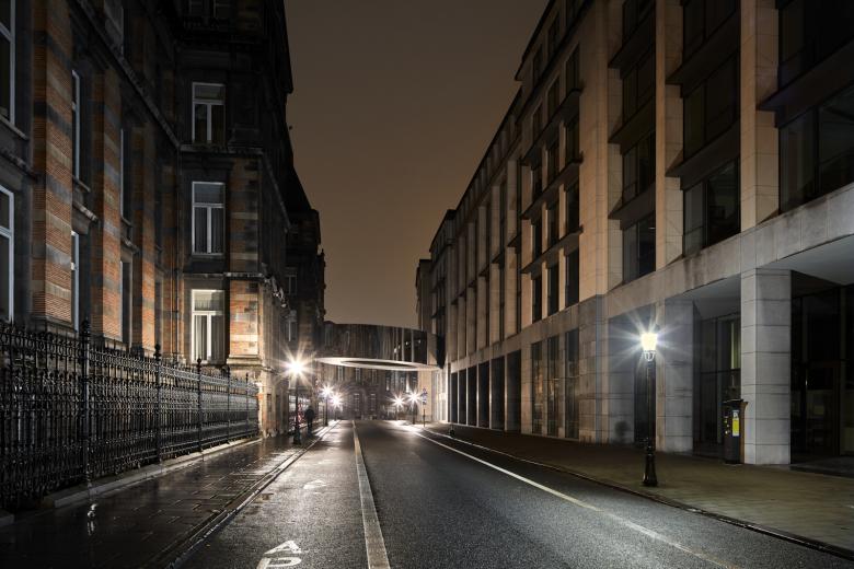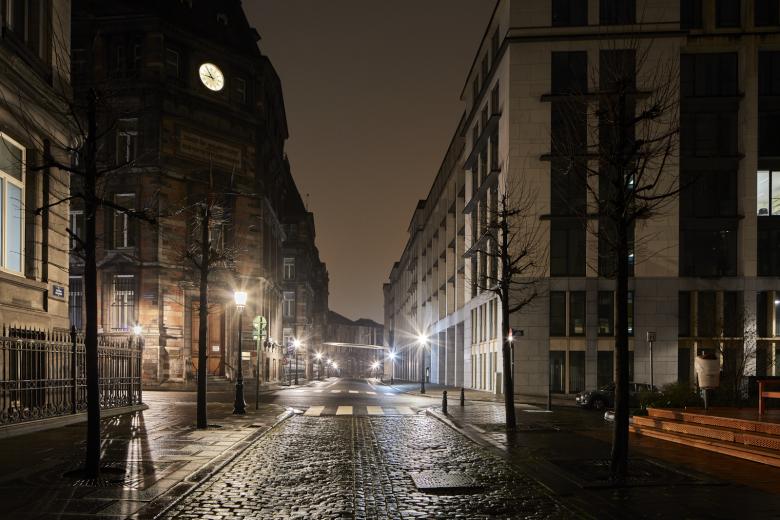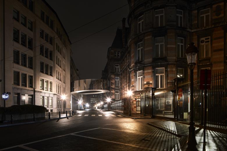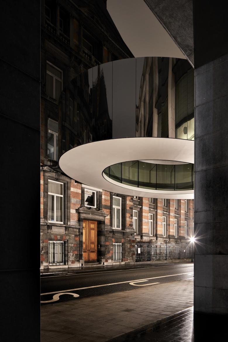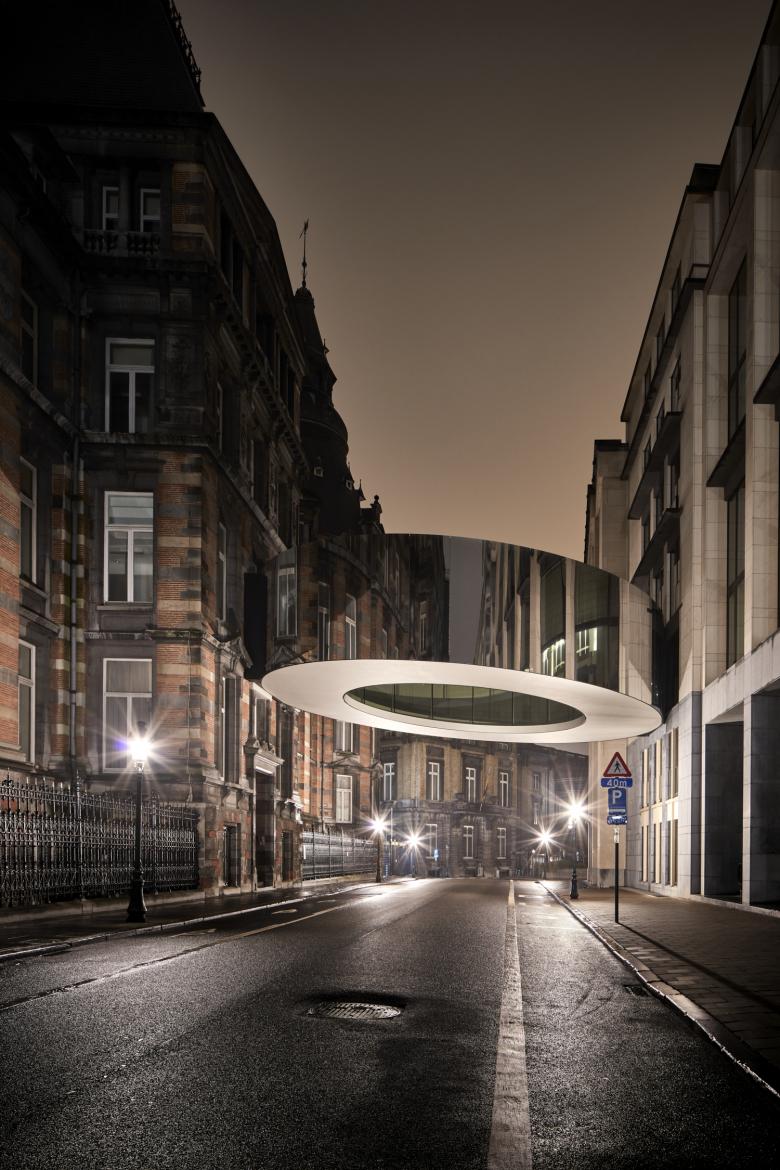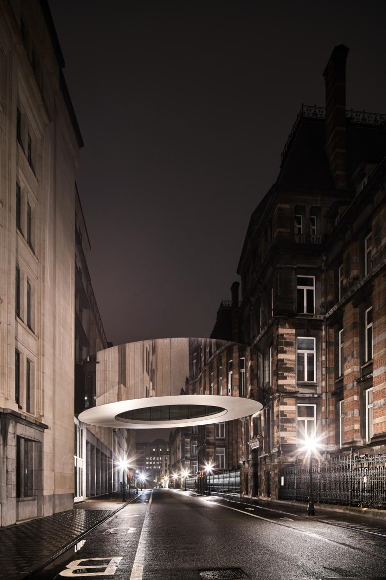 ‘Tondo’ is a footbridge that connects the House of Representatives’ offices with its recent extensions, the new Forum Building, on the other side of the Leuvensestraat in the centre of Brussels. The bridge was explicitly designed as a spatial element, rather than a technical solution. Named after the tradition of the ‘Tondo’, a circular renaissance painting, it’s shaped like a ring, and tucked between the two facades. There is a generous walk around an enclosed outer space, which also functions as an escape and meeting space. At the same time, the ‘detour’ also allows the height difference between both buildings to be bridged by means of a single, accessible slope of 4%. Towards the city, the bridge shows itself as a ‘closed’ element, in the tradition of, for example, the Bridge of Sighs. Coated with mirrored panels, they reflect the facades of both the Forum building and Parliament. From closer she shows through the opening a subtle view of the passages between the two buildings. Structurally, the bridge can be described as a stiff disc, the roof, on which the floor hangs with a minimal presence of structure: a near ephemeral pavilion between the buildings. Viewed from above, however, the sculptural beam game of the structure is visible: an ‘eye’ on the world.
