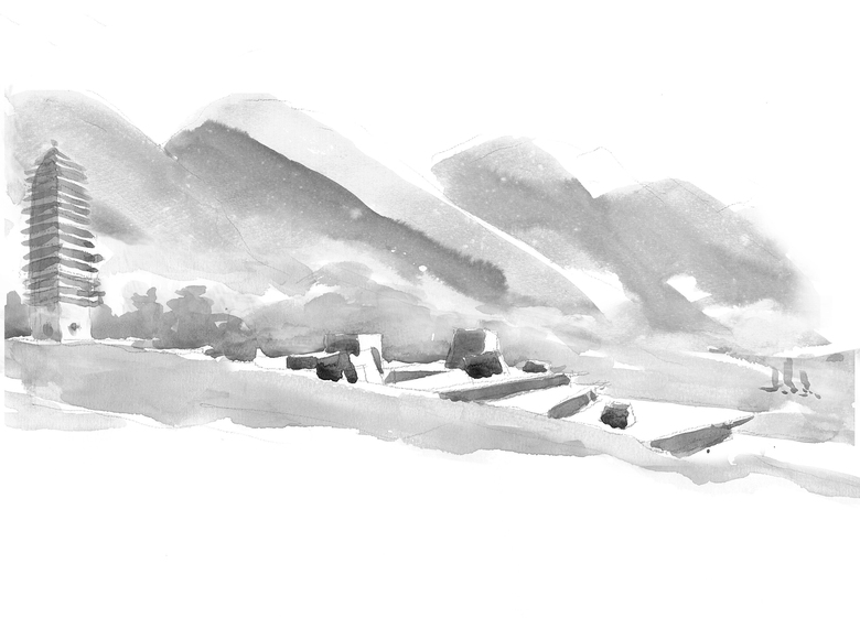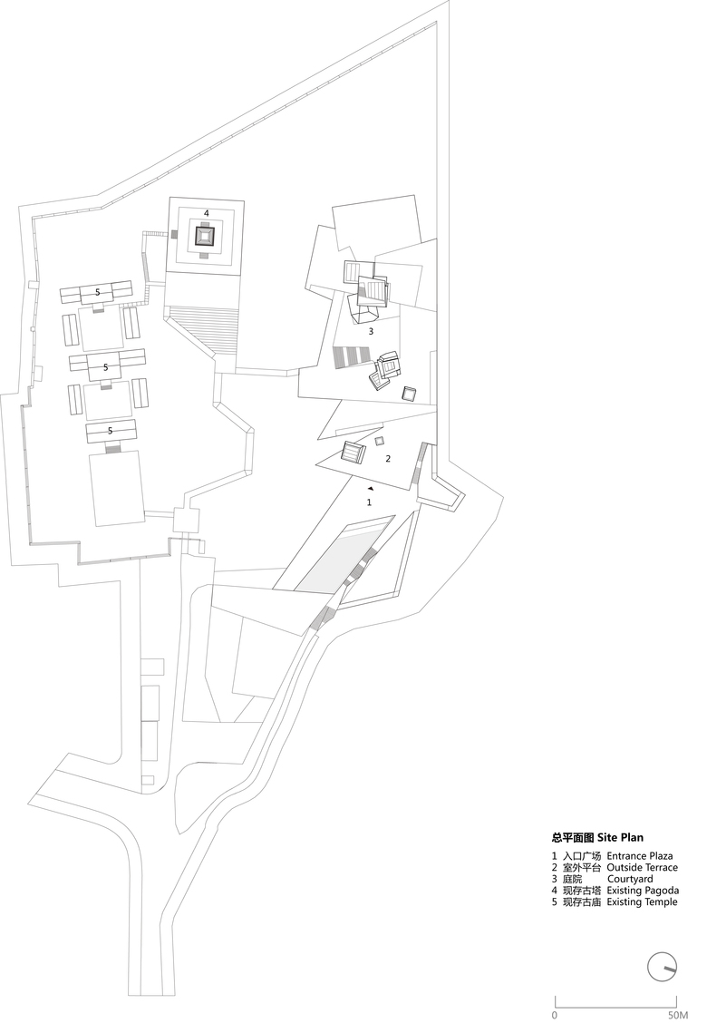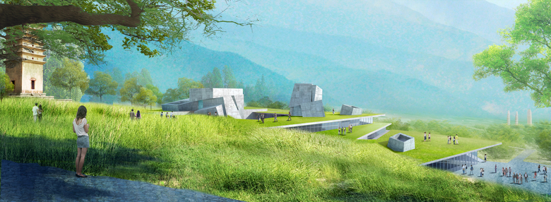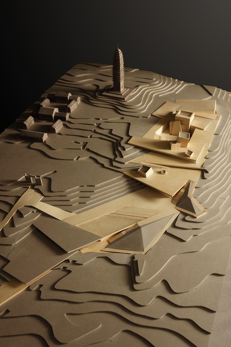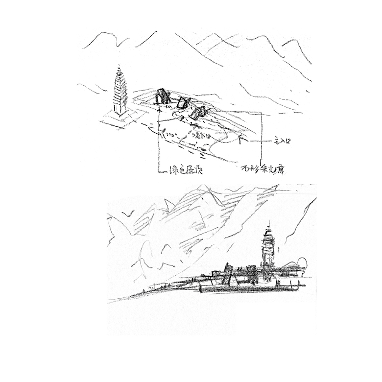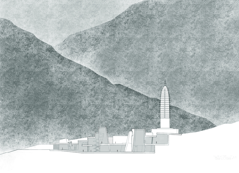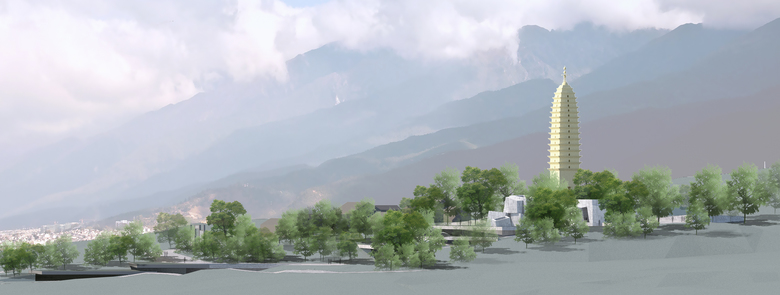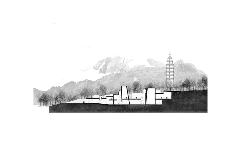Although the 9thC and 10thC Three Pagodas located north of Dali are famous, the Hongsheng Temple Pagoda dating from the same period and just to the south of the city is relatively unknown. Next to this Buddhist pagoda is the abandoned TaoistLaojun Temple from the Qing Dynasty,with the majestic Cang mountain range in the background. Studio Zhu-Pei received the commission for a Museum of Contemporary Art on the grounds of the Hongsheng Temple Pagoda and the Laojun Temple, after the client had learned about the design for the Yang Liping performing Arts in Dali.