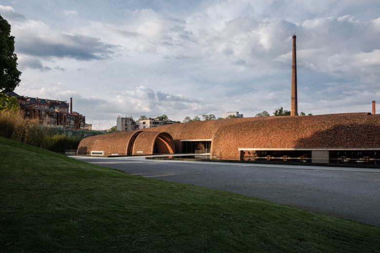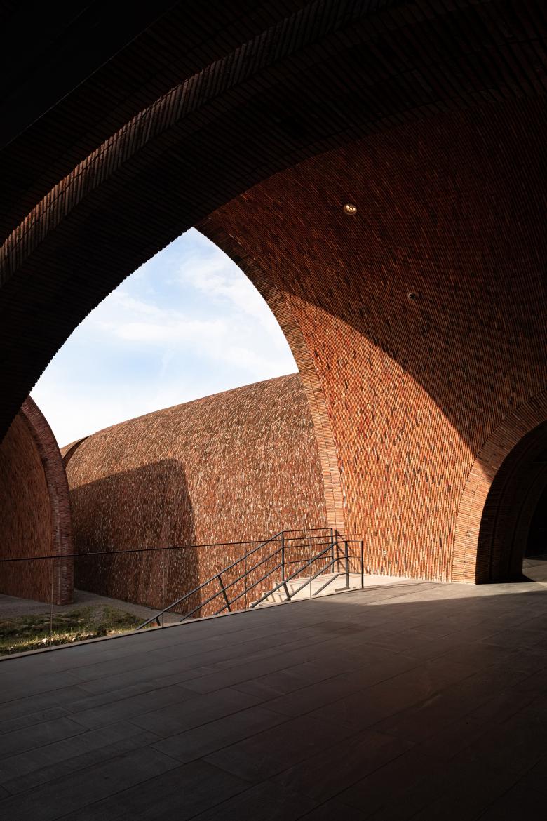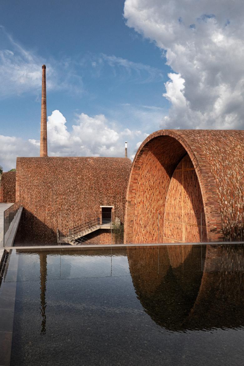 The architect was fascinated by local ancient kiln tectonic and material. Looking in the past, craftsmen built the brick kiln without scaffolding in a very special way. Thin and light brick kiln achieved a maximum interior space with minimum materials, the brick kilns appeared in organic forms reflecting heat flow from one end to another.