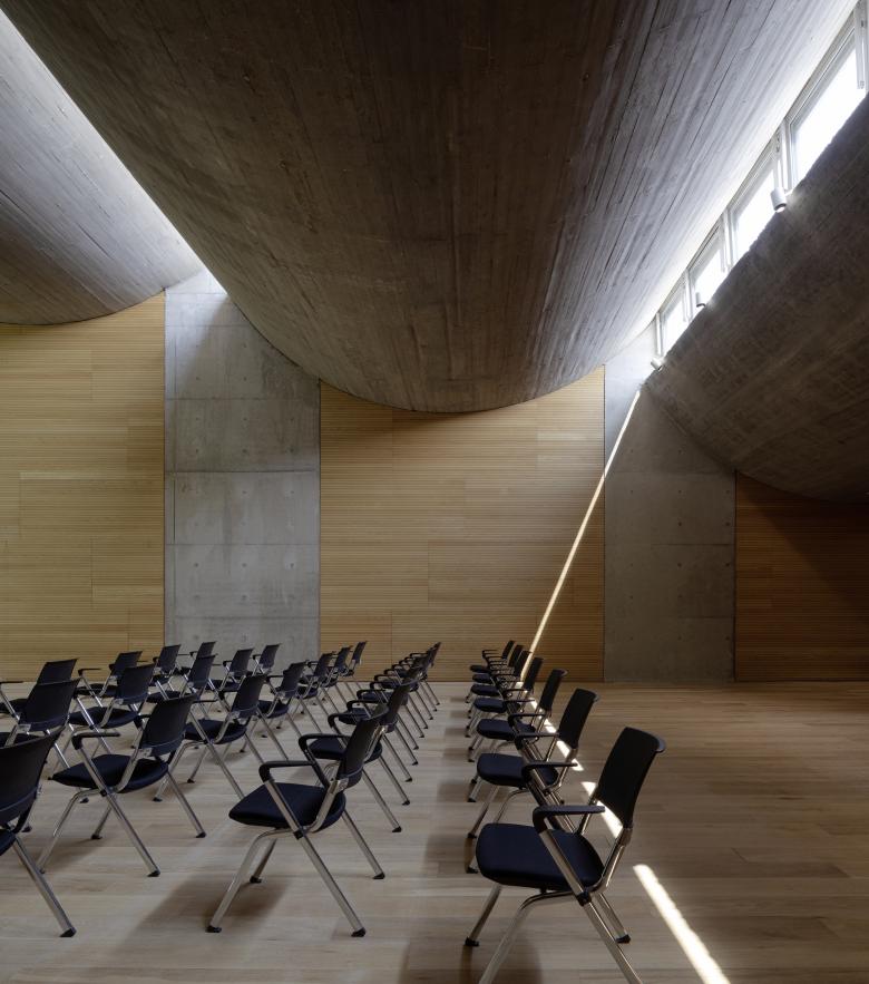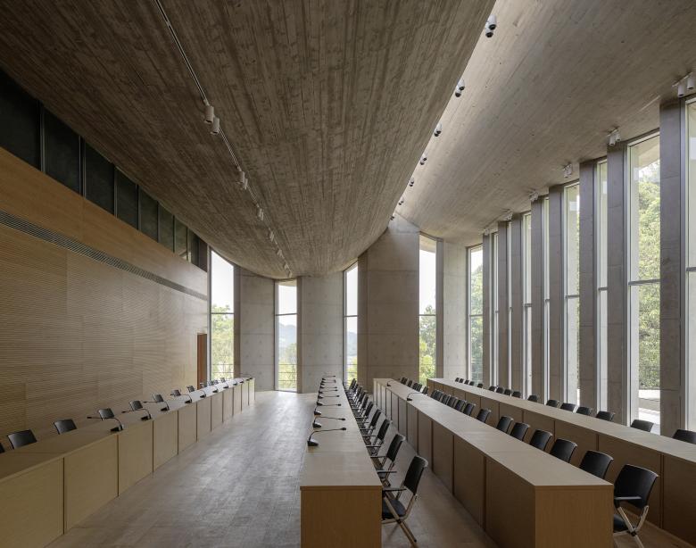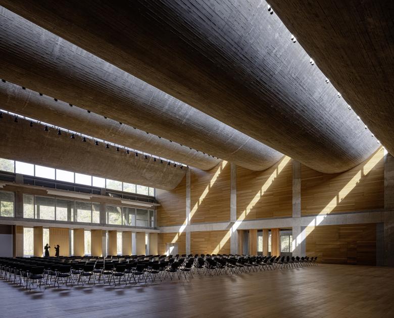 In order to realize such a group of buildings, combining the complexity of the site, and exploring a simple, authentic, and easy-to-build structural form becomes the key. A lot of inverted single-curved arches that hang down and are full of structural tension are repeatedly combined and changed as roof units, which is a metaphor for the mutated Chinese double-eave architectural form. The unique elastic eaves curves in ancient buildings and the slightly recurved roof language formed by the raised frames are fully captured in Zijing International Conference Camp's huge curved surfaces, which are layered and full of changing rhythms. The staggered arches change the refraction and diffusion of light to adjust natural light, combined with the opening and closing of skylights and the control of curtains, the indoor space realizes the maximum possibility of natural lighting and ventilation.