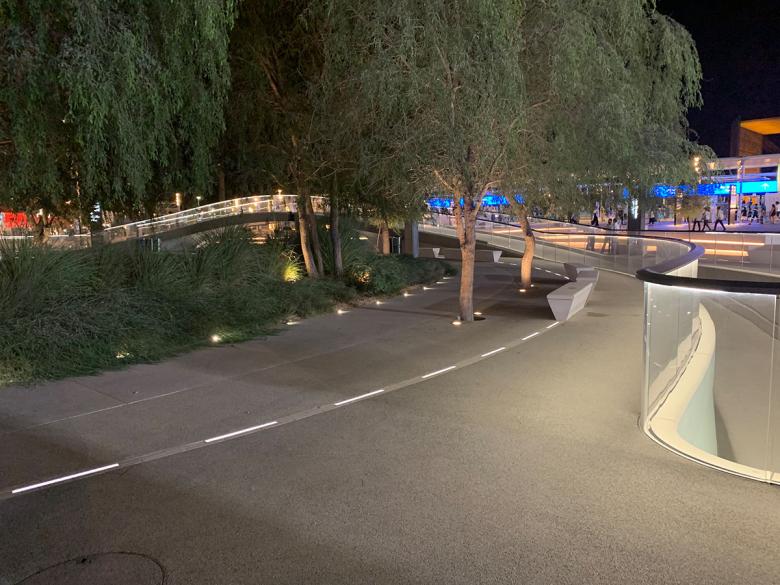 A total of 870 LLF40.20 LED-Lightlines with a length of 620 mm were installed in the ground around the pavilion. The LED-Lightlines can be walked on and rolled over, which is important because it is a public place with a lot of human traffic.