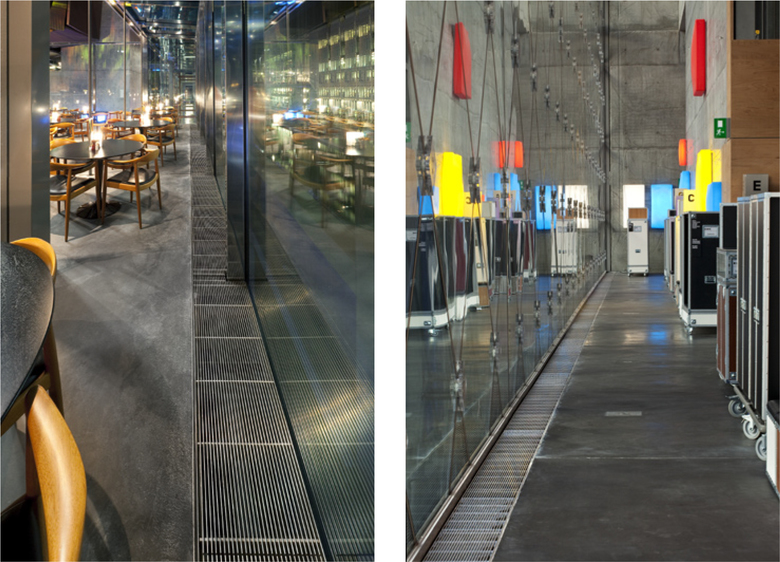 The ventilation grating inside and the drainage grating outside are also beautifully designed - they are identical in design and appear filigree. Less visible, but important: With cantilevers anchored in the concrete and screed, the climate gratings have a special reversible substructure that prevents sound from being transmitted into the concert hall.