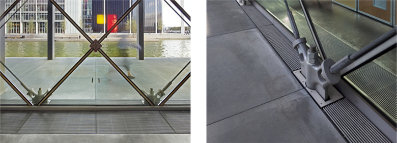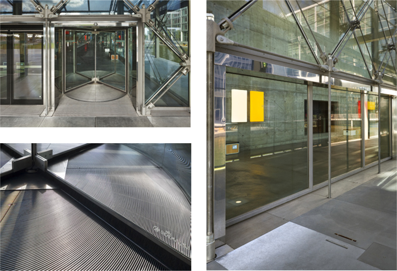 - for the transitions inside/outside at swing, wing and double sliding doors partly curved, partly straight linear gratings made of brushed stainless steel with 5 mm bar distance; walkable with stiletto heels; loadable with 4 KN on 100 x 100 mm