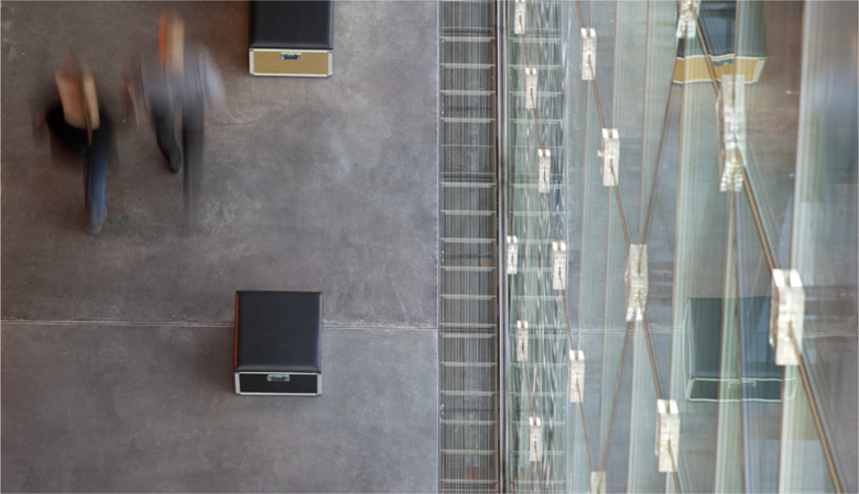 The concert hall is a global work of art: the idea of controlling the sound quality with a sail above the heads of the audience came from Japan. Other details were designed and manufactured by TTC in Germany: Eye-catching are the revolving doors in the entrance area. They move on grates, each of which looks like a giant metal record. A stylized sound carrier as entrance! Both the Danish Broadcasting Corporation as the client and the architect were enthusiastic about this subtle detail.