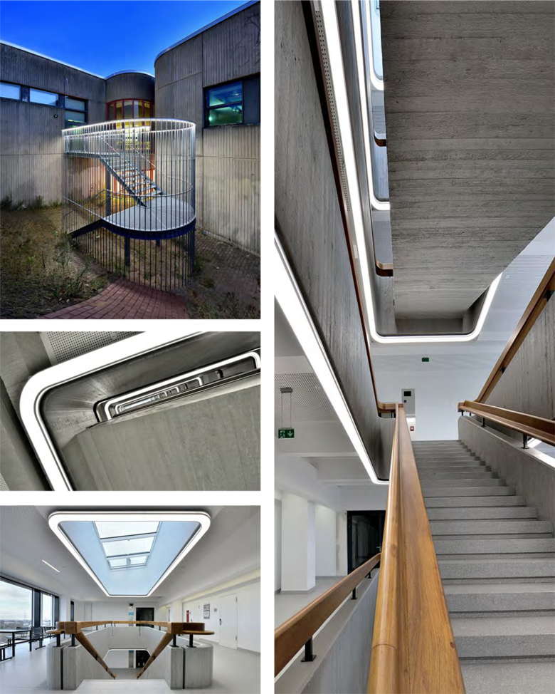 In contrast to this project, for the Chemical-Medical Institute at the uni ADO Lights developed a light sculpture that illuminates the stairwell. Its shape is based on that of the high-grade, curved stair handrail. Installed on the concrete substructure a slender black steel casing then serves to hold the light sculpture based on high-performance LED modules. A cover made of satin-finished PMMA plastic ensures homogeneous, diffused lighting. On each story the circle of light has a length of 19.5 meters and an intensity of 85,000 lumens.