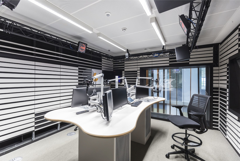 TV an radio studios in particular have high requirement. The basic noise level must not exceed a certain value, for instance, otherwise the sound of the technical equipment or air-conditioning units can be heard in sound recordings. This translated into NR 20 standard acoustic requirements. An additional installation was to effectively support the envisaged cooling ceiling system, for in the studios themselves a maximum room temperature of 26 degrees was defined, and in the control room, for example, 24 degrees. A further requirement was that as little of the wall surface as possible should be coveres, because it is used for sound absorption.