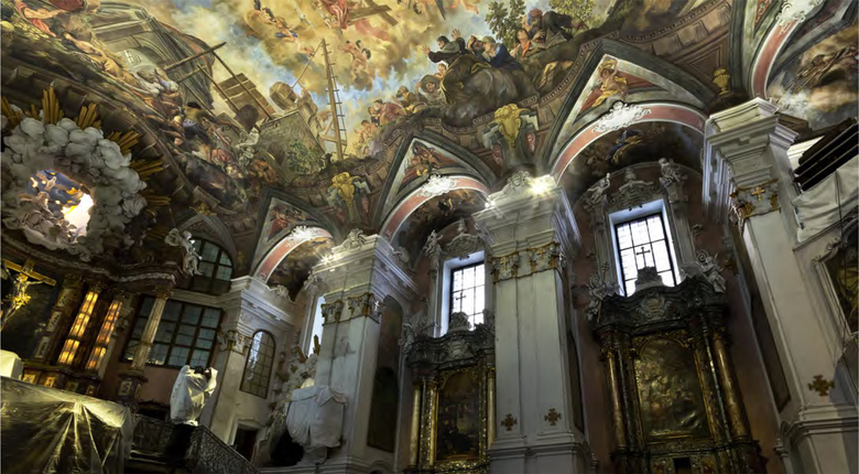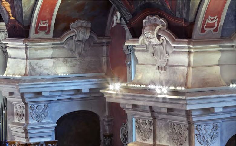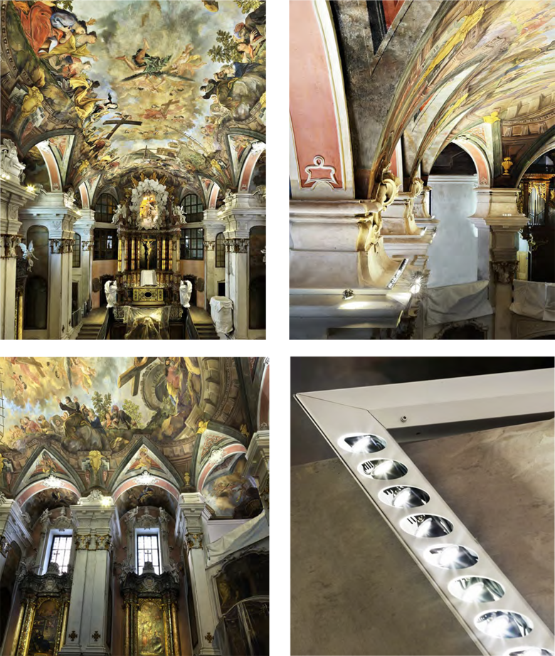 The fact that this detail – as well as the dramatic depiction of the True Cross’s discovery – can be discerned is due to leading-edge illumination. A total of 224 “LED Luc spots” were mounted on the columns’ abacus slabs. The thumbsized fixtures and all the required cabling are encapsulated in flat custom-manufactured steel housings. The inconspicuous solution complied with the client’s intent that the viewers of the painting not be distracted by technical details. The overall technical design concept includes other products from ADO Lights: 20 LED spotlights for punctilinear illumination, as well as two wall luminaires, each containing seven “LED Luc spots”. All the equipment was custom-fabricated to achieve a discreet appearance, yet with a forceful effect produced by the radiant power of the lighting elements.