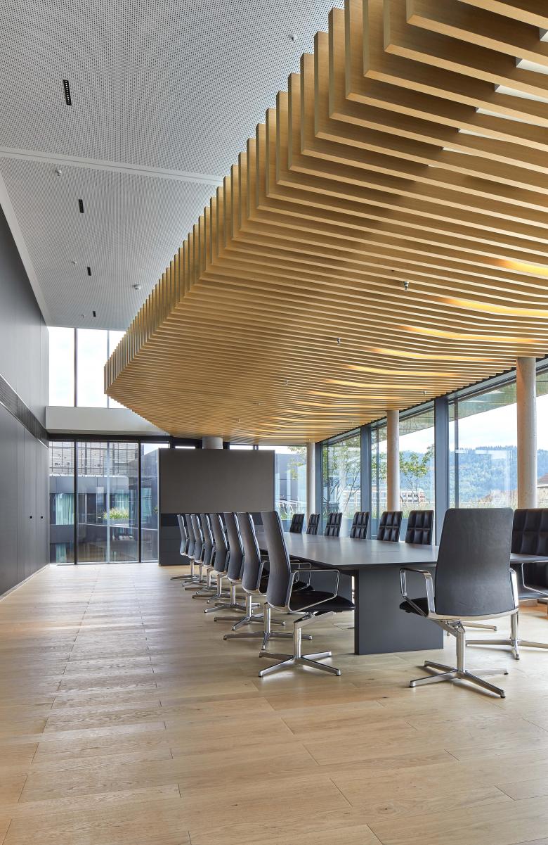 However, finding a suitable way to connect the inside and the outside of the new build was not the only consideration in this case. For the interior, despite the very disparate usage concepts, it was possible to limit the number of colors and materials. Here different gray tones and oak have been used. A similar kind of harmony is reflected in the fixed indoor lighting, which has been restricted to only a few products, again courtesy of ADO Lights. The uniform intensity and quality of lighting is guaranteed by the Gallery LED – elegant yet unobtrusive downlights integrated into the ceiling in strips of three, six or even 12. The Aurora LED spotlights provide additional cones of light at selected points.