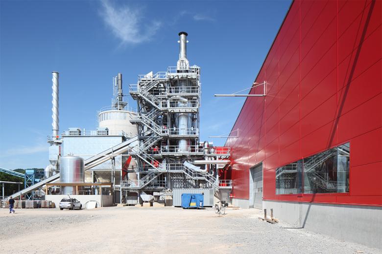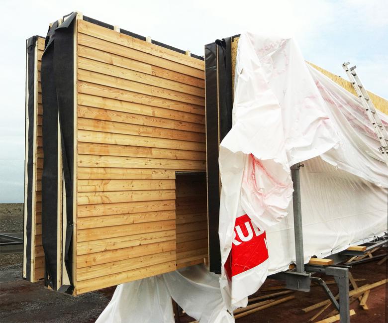 Die über 200 m langen Aussenfassaden des Produktionsgebäudes bestehen aus vorgefertigten Holzelementen aus naturbelassenerr Lärche. Die Rundholzaufgabe und die technischen Anlagen haben eine Fassade aus feuerroten Metallpaneelen. Im Inneren überspannen schlanke Brettschichtholzbinder die Hallenschiffe und ermöglichen zahlreiche Erweiterungen.