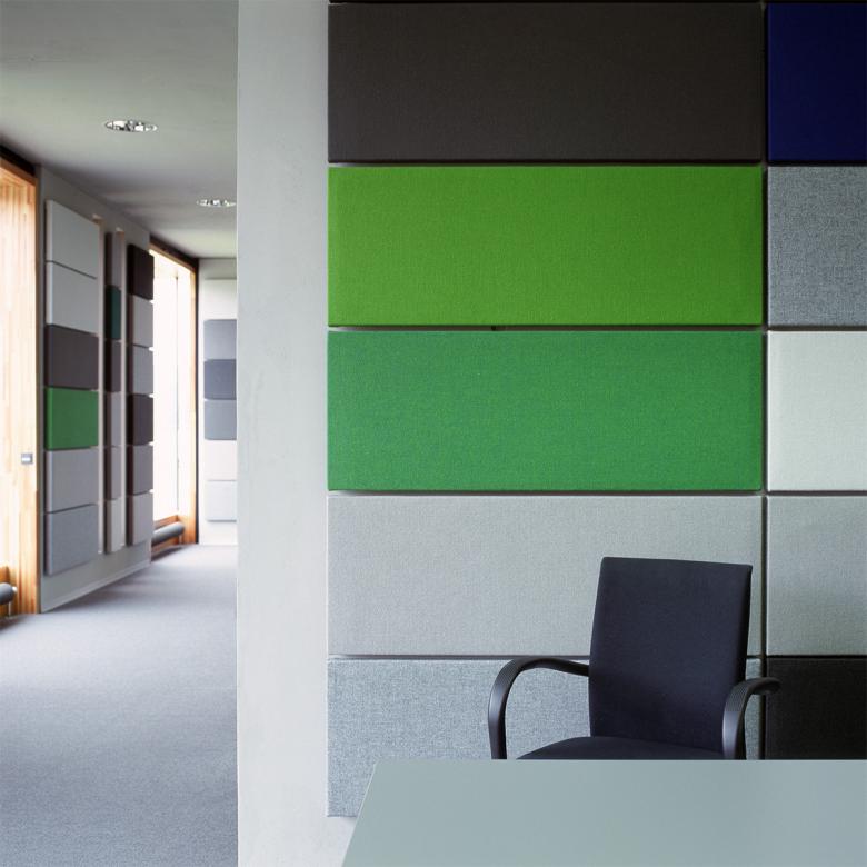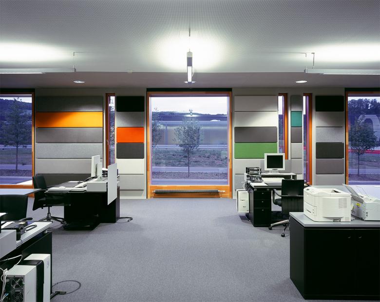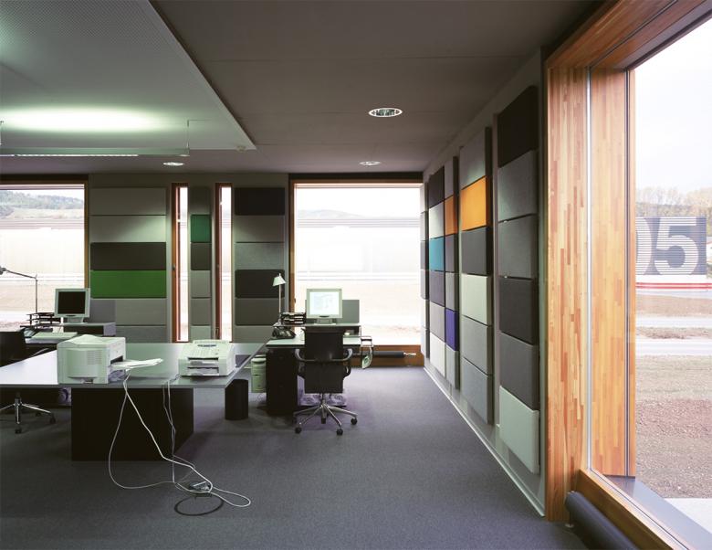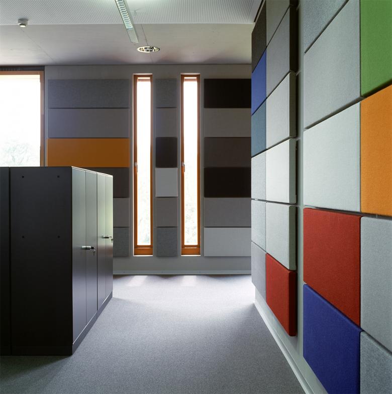 Um das ‚optische und akustische Raumklima‘ positiv zu beeinflussen, wurde ein System von stoffbespannten Paneelen entwickelt. Über 1500 dieser Tafeln in 17 verschiedenen Farben sorgen, in Gruppen an den Wänden der Büroeinheiten hängend, für eine angenehme visuelle Erscheinung und Akustik. Je nach Tageslicht und Himmelsrichtung verändert sich die optische Wirkung der Stoffpaneele. Im Herbst korrespondieren beispielsweise andere Farben mit den Farben der umgebenden Natur als im Frühling und treten dann in den Vordergrund. Auch im Tagesverlauf verändert sich der Farbeindruck. Diese wechselnden Farbwirkungen sind sehr dezent und bereichern die Raumatmosphäre. Die Farbflächen sind keine zufällige Auswahl: Sie wurden in Format, Maßstab und Proportion, Menge, Dichte, Oberfläche und Textur, nach Reflexionsvermögen und der Interaktion mit benachbarten Farbfeldern ausgesucht und gezielt platziert.