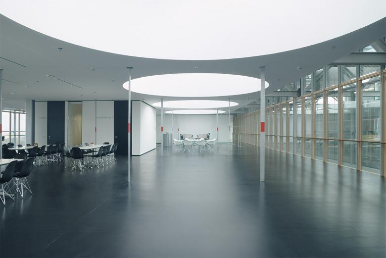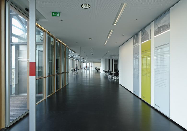 Zentrale Idee der Raumdisposition ist die Integration der Mitarbeiter in ein Team als Voraussetzung für den gemeinsamen Erfolg. Die in zahlreichen produzierenden Unternehmen vorhandene räumliche Trennung von Produktions- und Administrationsmitarbeitern ist durch unser Raumkonzept aufgehoben: Sämtliche Wege bei Schichtwechseln sowie in den Pausen führen über das großzügige ‚Mannschaftsdeck‘, hier begegnen sich Mitarbeiter aller Abteilungen (und auch Besucher) buchstäblich auf einer Ebene.