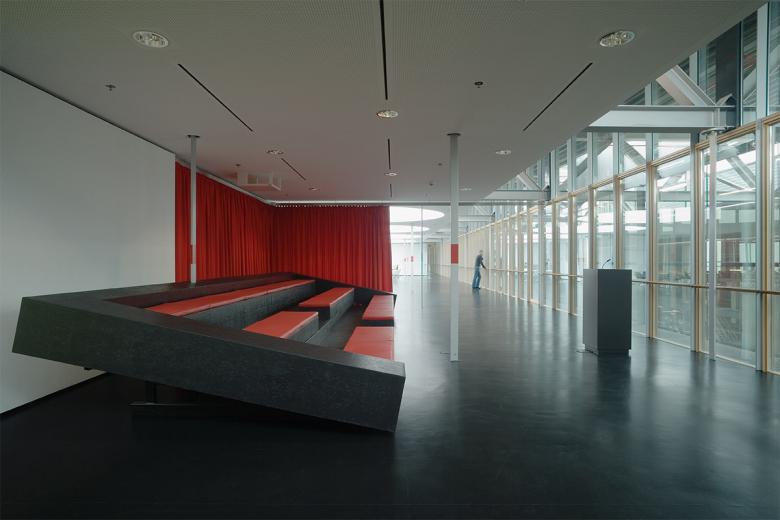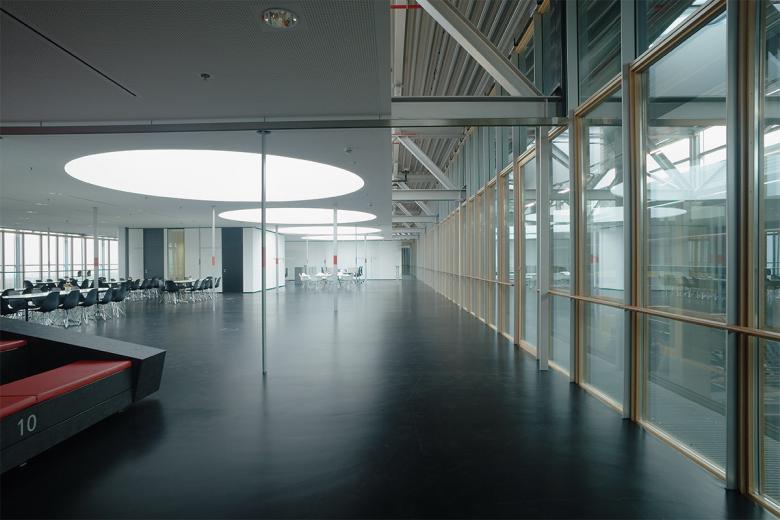 Auf dieser zentralen Ebene sind sämtliche kommunikativen Funktionen des Werkes zusammengefasst: Die an schlanken Stahlprofilen abgehängte Konstruktion nimmt als ‚Mannschaftsdeck‘ Cafeteria, Büro- und Ausstellungsbereiche, Sozialräume und Umkleiden, sowie ein Auditorium auf. Hier werden Schulungen für Mitarbeiter sowie Vorträge für Besucher und Kunden angeboten. Für diese Veranstaltungen kann der Bereich mit einem raumhohen Vorhang abgeschirmt werden.