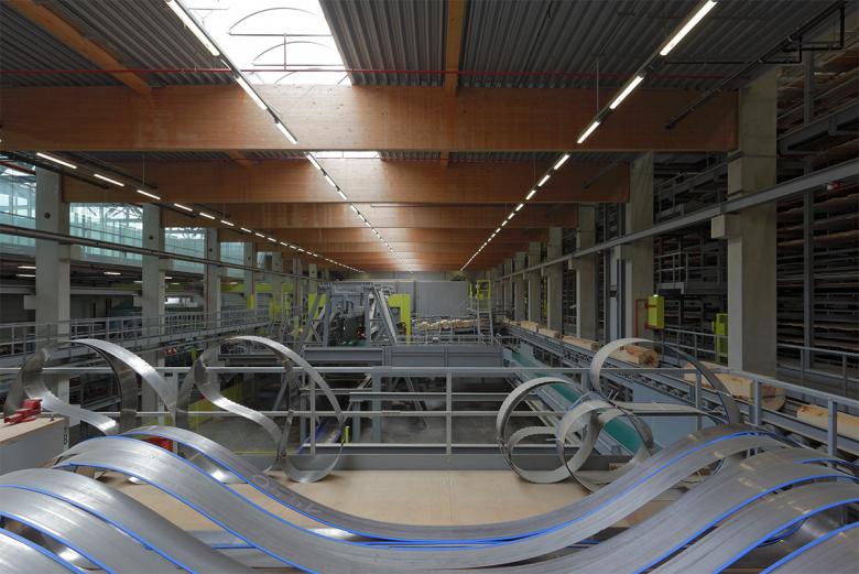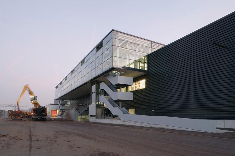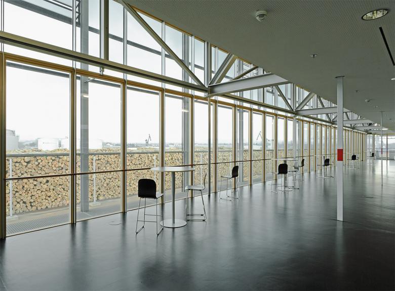 2007 wurde das dritte Massivholzwerk des Auftraggebers eröffnet; dank zahlreicher produktionstechnischer Innovationen gilt die Anlage als Europas modernstes Laubholzsägewerk. Nach intensiven Standortanalysen haben wir ein 10 Hektar großes Grundstück im Mainhafen von Aschaffenburg entwickelt. Hier ist man nah am Rohstoff (Buchenwälder von Spessart, Odenwald etc.) und hat die logistisch unmittelbare Anbindung an ein Containerterminal mit regelmäßigem Liniendienst nach Rotterdam. Letzteres ist entscheidend, da die Firma ihre Produkte weltweit vertreibt.