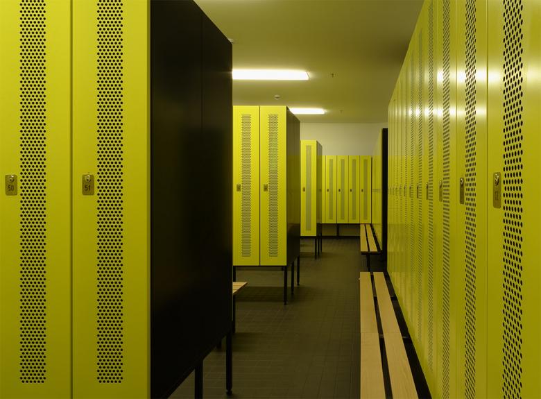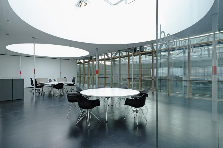 Einzelne Funktionsbereiche, wie Umkleiden, Küche oder Besprechungsräume sind innerhalb der Ebene in freistehenden Boxen organisiert. Für Teambesprechungen steht direkt auf dem ‚Mannschaftsdeck‘ ein Besprechungsbereich mit Sichtverbindung in die Produktion zur Verfügung.