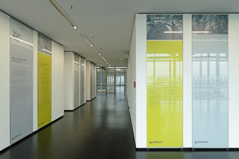 Besucher können sich bei einem Rundgang an Ausstellungstafeln über den Werkstoff Holz und die Rolle der Forstwirtschaft als Rohstoffproduzent und Faktor gegen den globalen Klimawandel informieren.
