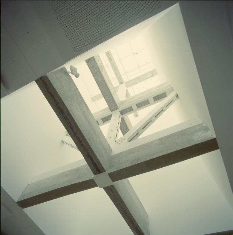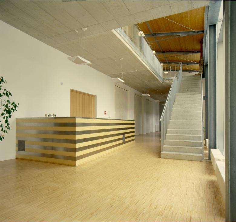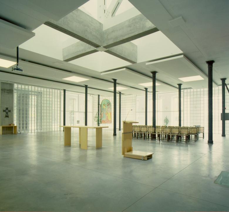 1. Im Erdgeschoss Einbau einer Kirche samt Pfarrhaus, Taufkapelle und Jugendzentrum. Der Kirchenraum ist ein Zentralraum dessen Stimmung von der Mehrschichtigkeit seiner Hülle und Licht lebt. Das Licht fällt durch einen mächtigen, das gesamte Gebäude durchdringenden Schacht, dessen Tragkonstruktion zur Skulptur geworden ist, auf den Altar. Fünf Meter hohe verschiebbare Glaswände bilden im Kircheninneren einen Kreuzgang. Die Taufkapelle ist im ehemaligen Turbinenhaus des Kraftwerkes untergebracht, bedient sich des vorgefundenen Wassers des Baches.