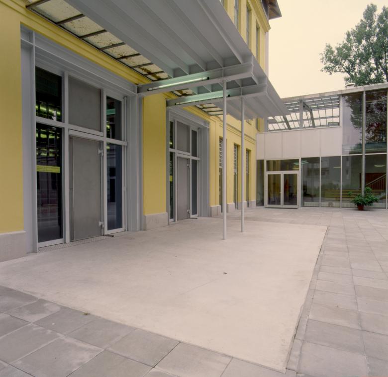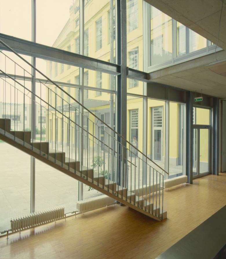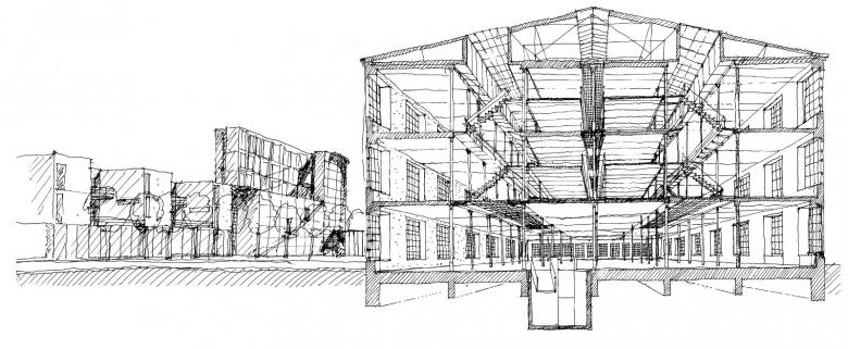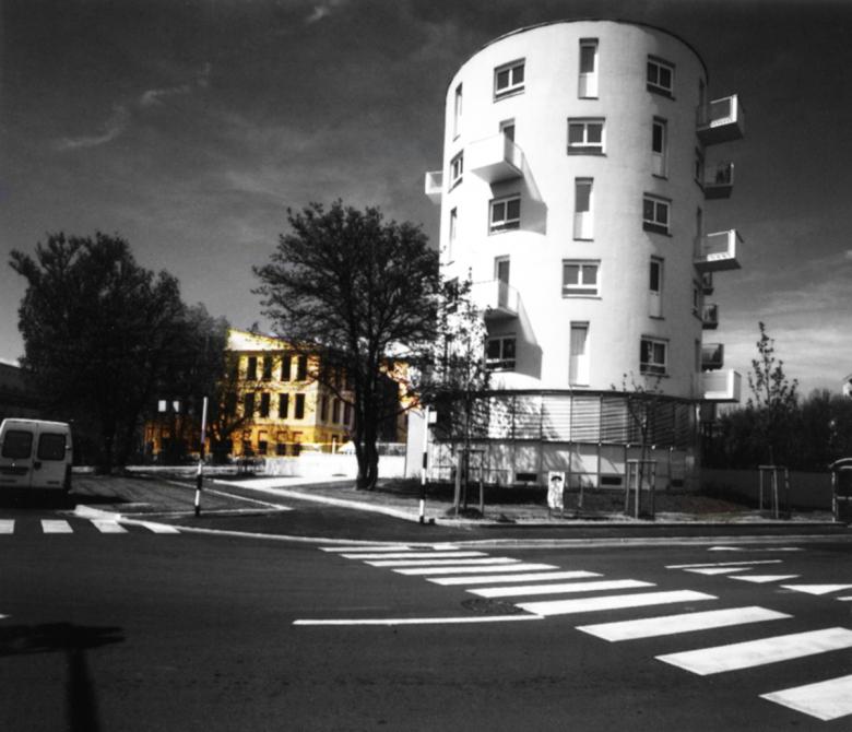 3. Parallel zum Altbau liegt der neue Wohnkörper mit seinem markant abgerundeten Kopfbau, der über einem Bürogeschoss auf sieben Etagen Kleinwohnungen beherbergt. Im langen Rumpf befinden sich Geschosswohnungen, die sich mit eigenen Gärten, Dachterrassen oder Balkonen zum schönen Hof orientieren und über Laubengänge auf der Ostseite erschlossen werden. Das Projekt ist ein Beispiel für die Konversion eines Industriebaus, die durch eine sinnvolle Umnutzung und die Ergänzung mit einem Neubau zur Verbesserung des gesamten Wohnumfelds führt.